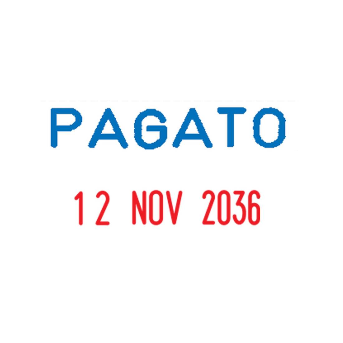 COLOPTimbro mini datario con dicitura fissa PAGATO con caratteri alti 4mm. Fusto antiurto in ABS. Tampone preinchiostrato bicolore blu/rosso (cod 38126). Tampone ricambio nero E/10 (cod 38117).