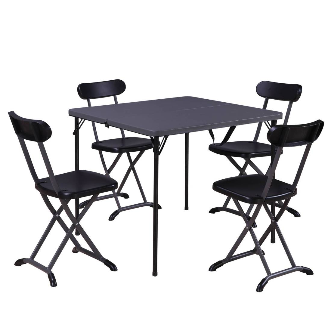 Garden FriendSet pieghevole composto da un tavolo quadrato e quattro sedie. Struttura in acciaio verniciato con vernici epossidiche color antracite, top in HDPE di colore antracite. Il set è consegnato montato e contenuto in due cartoni.Articolo destinato ad esclusivo uso domestico. Non adatto ad uso pubblico. Set composto da:1 tavolo H73 x P86 x L86cm 4 sedie H80 x P36 x L41cm
