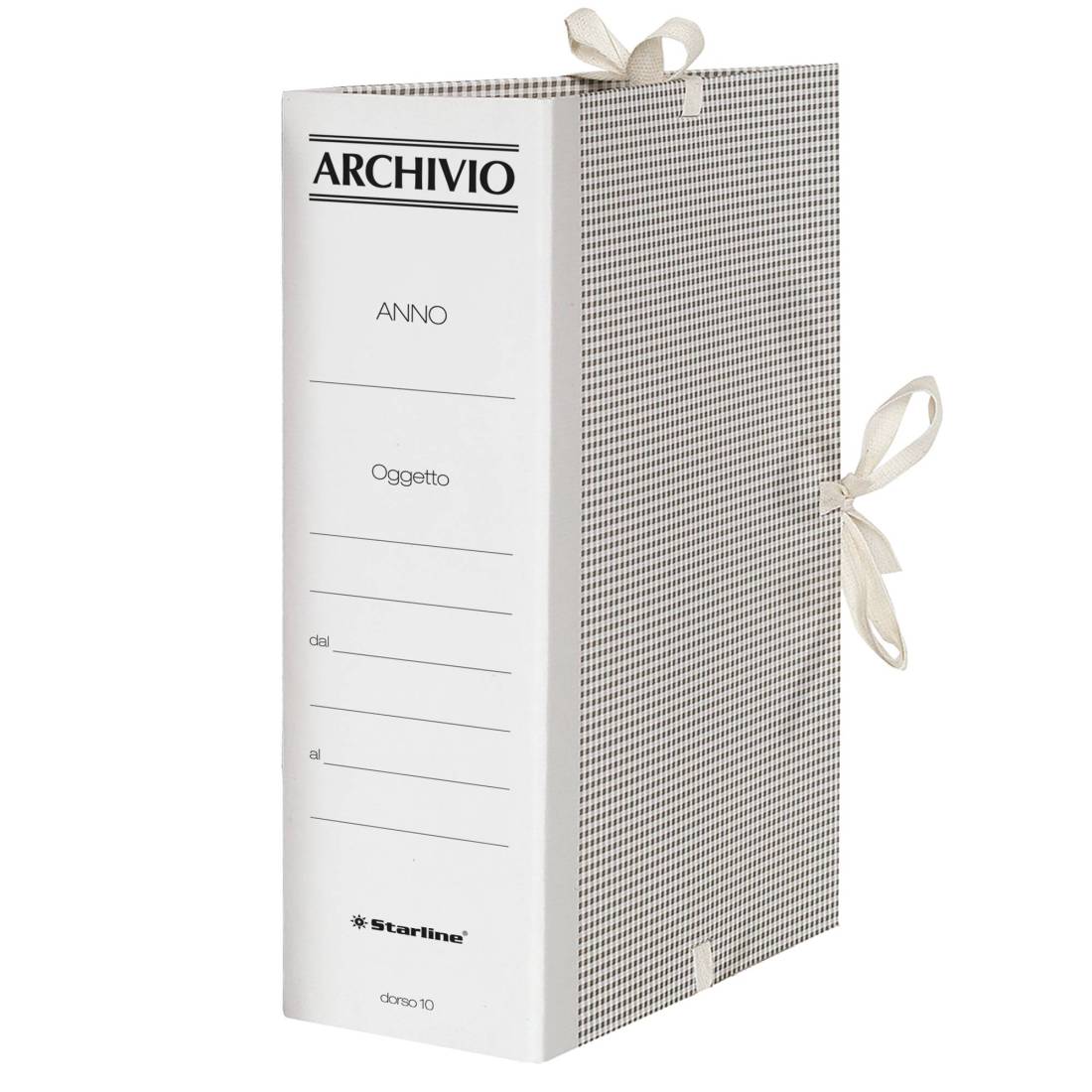 Cartella archivio con 3 lacci incollati. Realizzate in cartone teso grigio rivestito con carta uso mano da 80 gr/mq. Legacci a fettuccia fortemente fissati con collante. Formato 35x25cm. Dorso 10cm. Confezione da 25 faldoni.