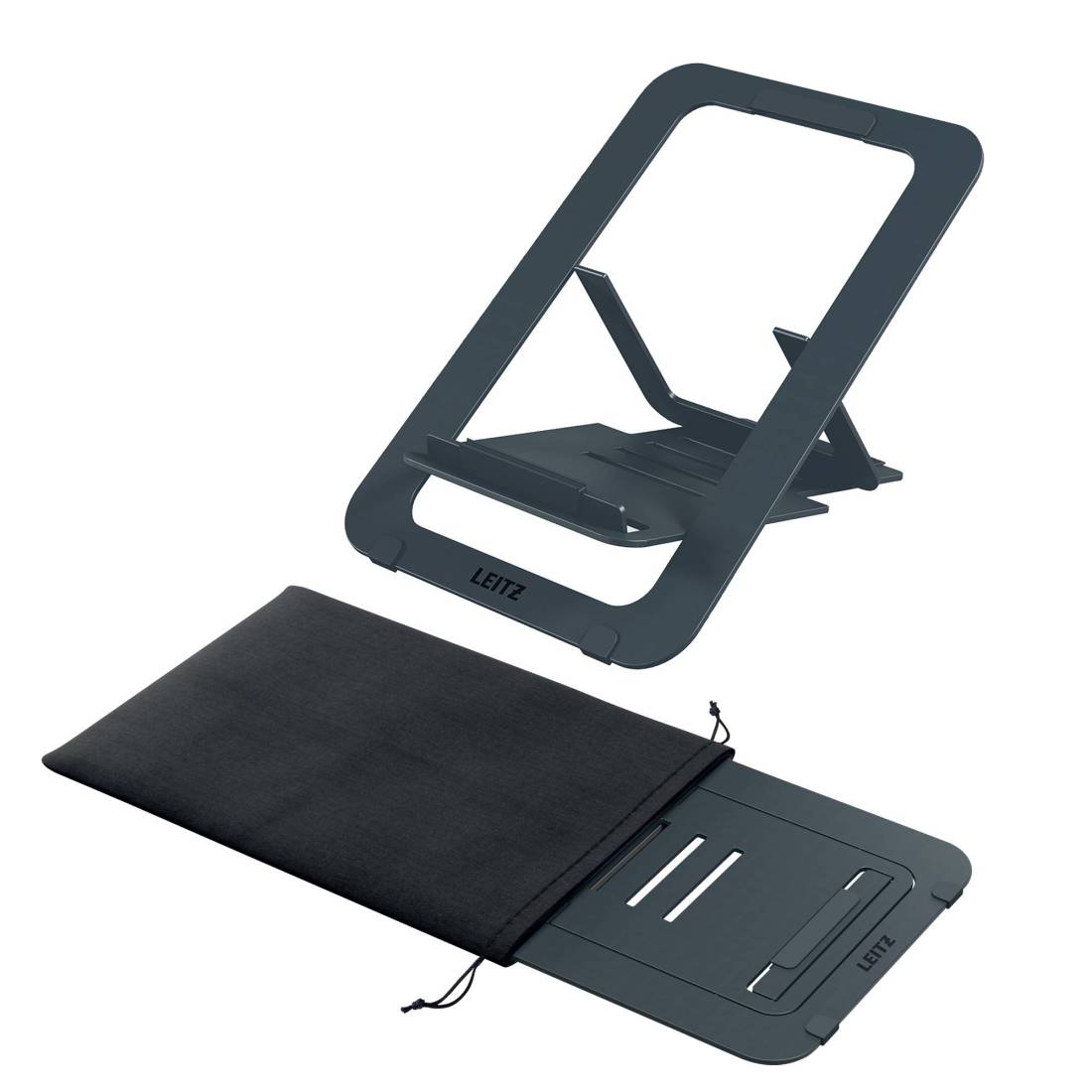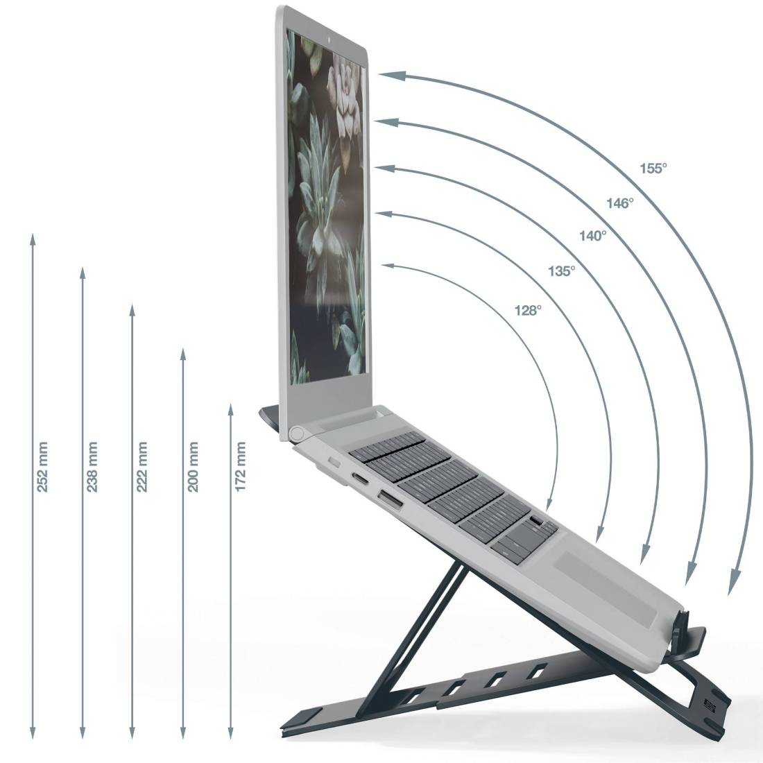 Supporto per laptop in alluminio, robusto e durevole, dal design ergonomico, per massimizzare il comfort sul posto di lavoro o in vi aggio. Solleva lo schermo del laptop dal tavolo per aumentare il comfort e contribuire a migliorare la postura mentre si è seduti o in piedi, per una migliore salute generale e per favorire il lavoro attivo. Ultra piatto con SlimLift Design (SLD) che rende il rialzo regolabile per laptop facile da usare in qualsiasi spazio a casa, in ufficio o in viaggio. Regolazione facile e veloce per creare l'angolo di visione perfetto, selezionando una delle 5 diverse impostazioni di altezza. Adatto per laptop e tablet da 10 a 17 pollici (I MacBook che si aprono a un massimo di 135 gradi possono essere utilizzati con l'impostazione di altezza di 172 mm e 200 mm). Garantisce la ventilazione del computer portatile favorendo il flusso d'aria per mantenere la batteria e gli altri componenti freschi. Sicuro e stabile grazie al gancio pieghevole ultrapiatto e agli elementi in gomma sulla base per evitare che il supporto per laptop scivoli. Design leggero e ultra sottile (6 mm) per essere facilmente riposto in una borsa per lavorare in mobilità o per essere conservato. Viene fornito con una custodia in cotone per proteggere il supporto pieghevole per laptop quando non viene utilizzato. Imballaggio privo di plastica e a fine vita riciclabile al 100% quando viene completamente smontato nei diversi tipi di materiale. Testato e raccomandato dall'Istituto tedesco IGR per la salute e l'ergonomia, secondo la norma DIN 26800 EN ISO 15537. Dimensioni:300 x 10 x 210