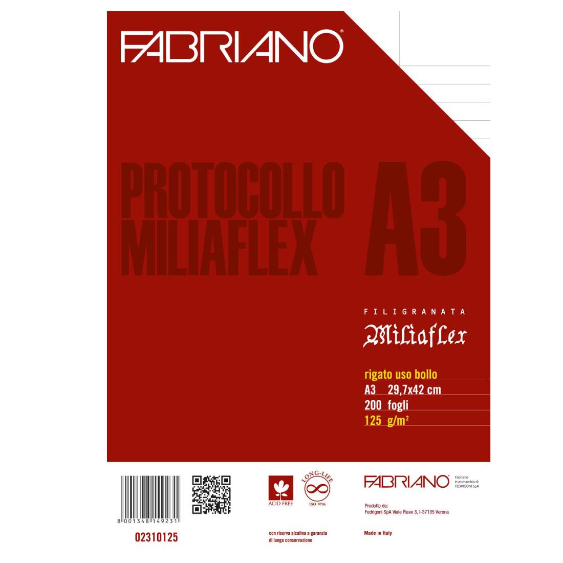 Protocollo rigato uso bollo c/margine. Carta di elevata grammatura, filigranata Miliaflex. Prodotta con il 100% di pura cellulosa ECF(Elementary Chlorine Free)-Acid Free, con riserva alcalina a garanzia di lunga conservazione-Long Life (ISO 9706). Collatura neutra a garanzia di una perfetta conservabilità nel tempo (200 anni). Foglio A3 piegato in 2.