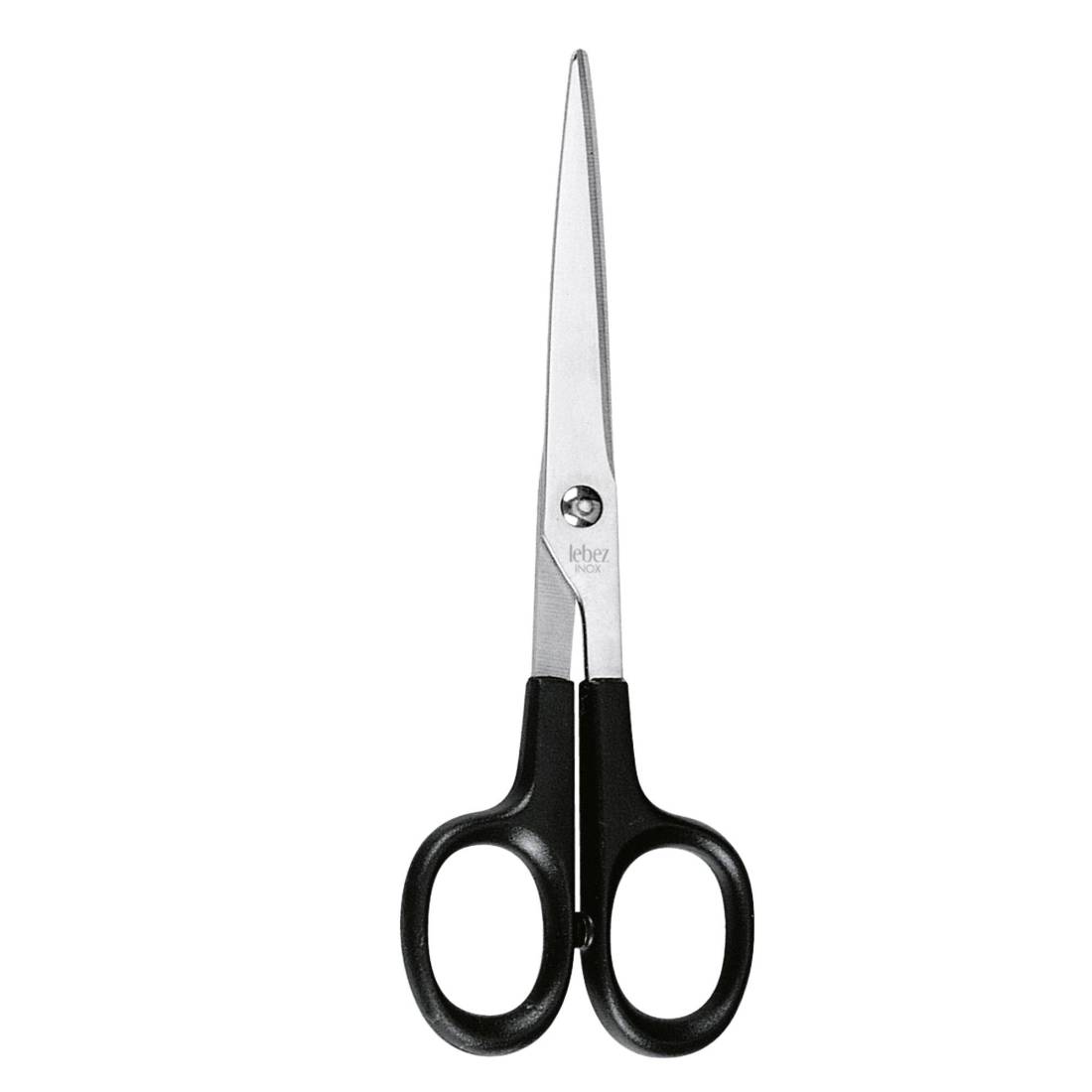 Forbice con lama in acciaio INOX. Impugnatura simmetrica in ABS nero. Lunghezza totale, compresa la lama, 17cm.