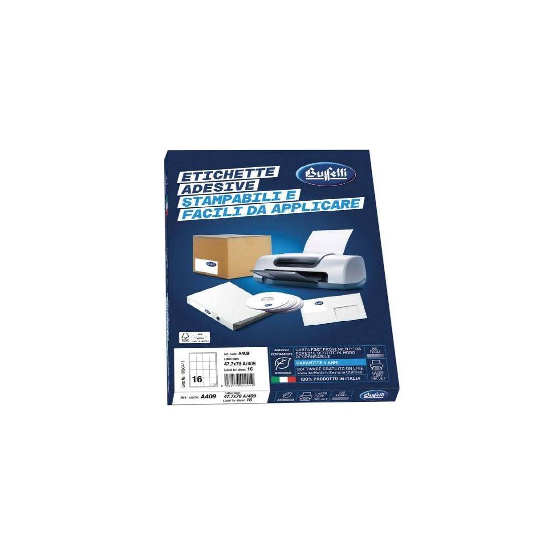 Ideate per completare in modo professionale le vostre spedizioni, per personalizzare raccoglitori ed ogni altro materiale per archiviazione, o per etichettare ogni tipo di prodotto. Etichette in carta di pura cellulosa lisciata in macchina. Grammatura: 70 g/m² ISO 536. Punto di bianco: 98% ISO 2470/1. Stampabilità: inkjet, laser, fotocopie, flexo, offset, serigrafia e scrittura manuale. Colla permanente universale, acrilico a base d'acqua. Ottima resistenza al calore. Buona adesione su cartoni e superfici non-polar (es. PE). Buona adesione anche alle basse temperature -20+100°C.