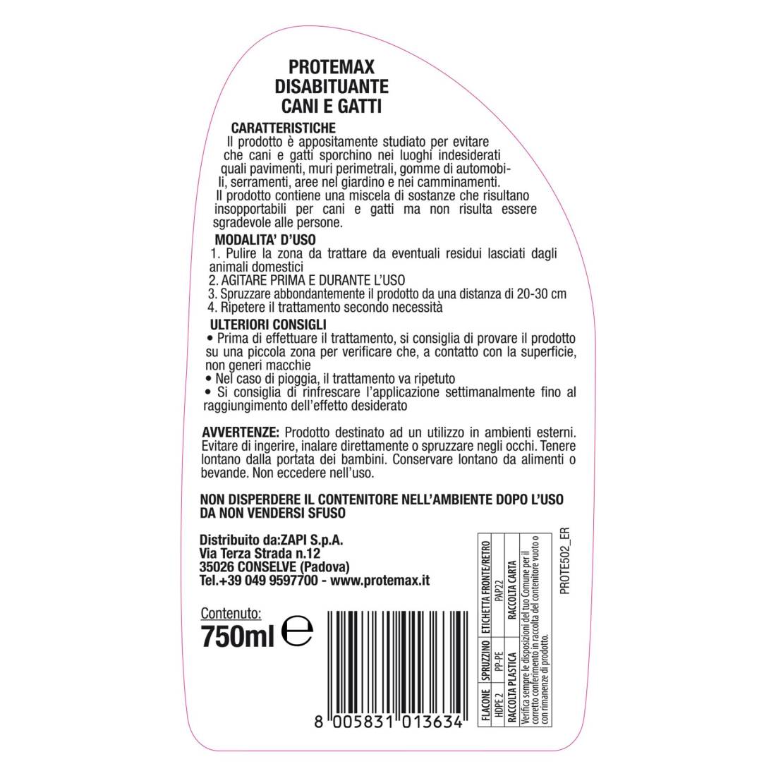 ProtemaxProdotto in spray no gas pronto all’uso appositamente studiato per evitare che cani e gatti sporchino con le proprie deiezioni in luoghi indesiderati. Indicato per: muri, cancelli, portoni, marciapiedi. giardini, terrazzi ed altre aree esterne.Modalita’ d’uso: 1. Pulire la zona da trattare da eventuali residui lasciati dagli animali domestici. 2. AGITARE PRIMA E DURANTE L’USO 3. Spruzzare abbondantemente il prodotto da una distanza di 20-30 cm 4. Ripetere il trattamento secondo necessità.