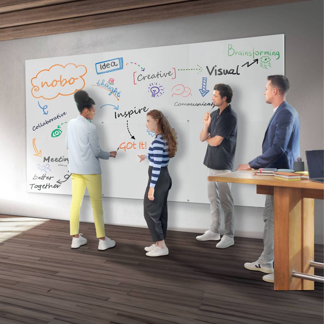NOBOLa lavagna a parete è ideale per le attività di collaborazione, come le sessioni di brainstorming e di pianificazione, in qualsiasi ambiente di lavoro. Semplice da installare, il sistema di montaggio magnetico permette ai pannelli senza cornice di stare insieme senza problemi sia in orientamento verticale che orizzontale. Le lavagne in acciaio hanno una superficie indurita dai raggi UV per una pulizia agevole e una finitura liscia e impeccabile.
