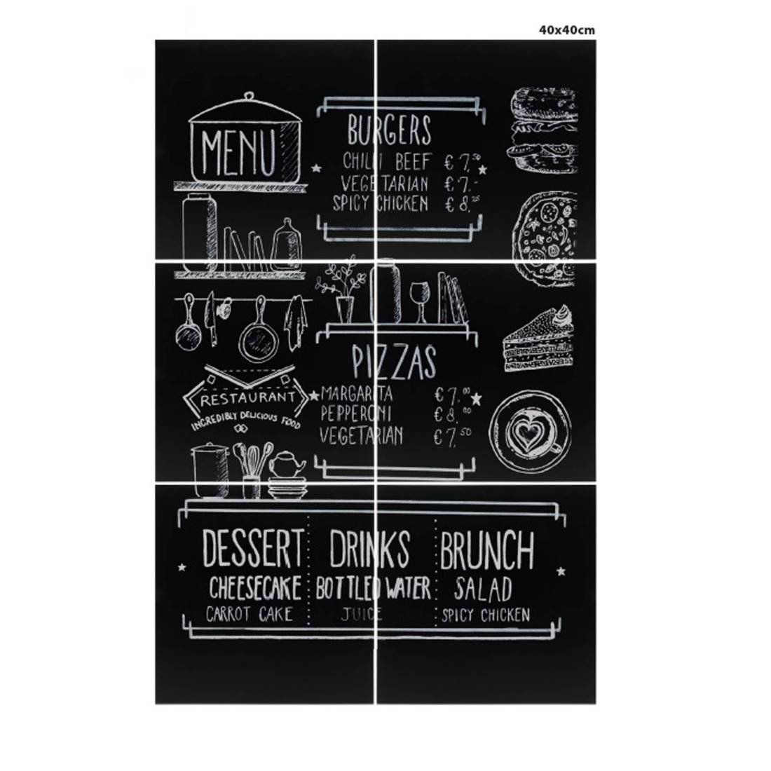 Kit composto da 6 lavagne 40x40cm per creare una lavagna XXL. Facili da pulire, resistente ai graffi, ai raggi UV, e agli urti. Utilizzabili con marcatori a gesso liquido. Adesivi per fissaggio a perete inclusi.