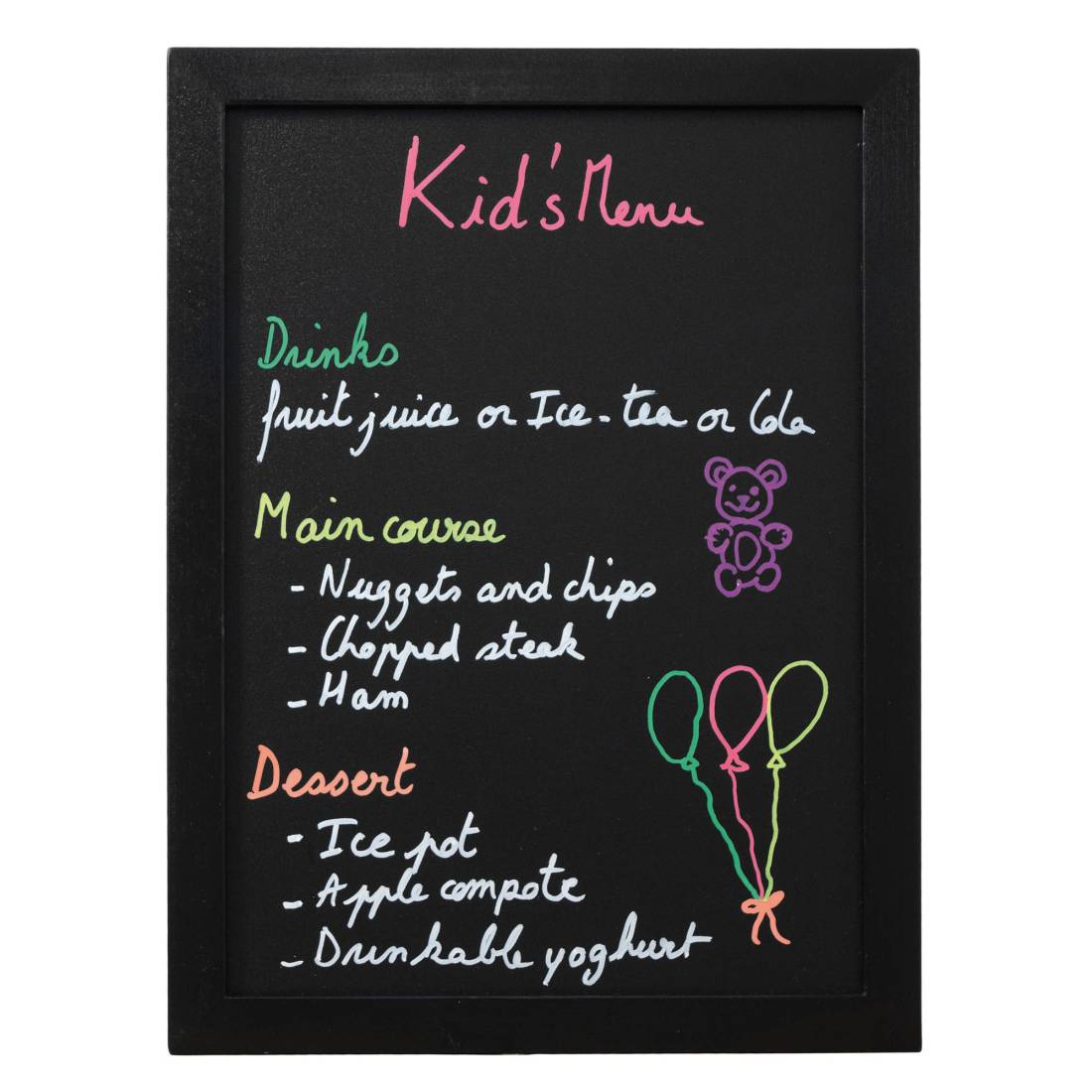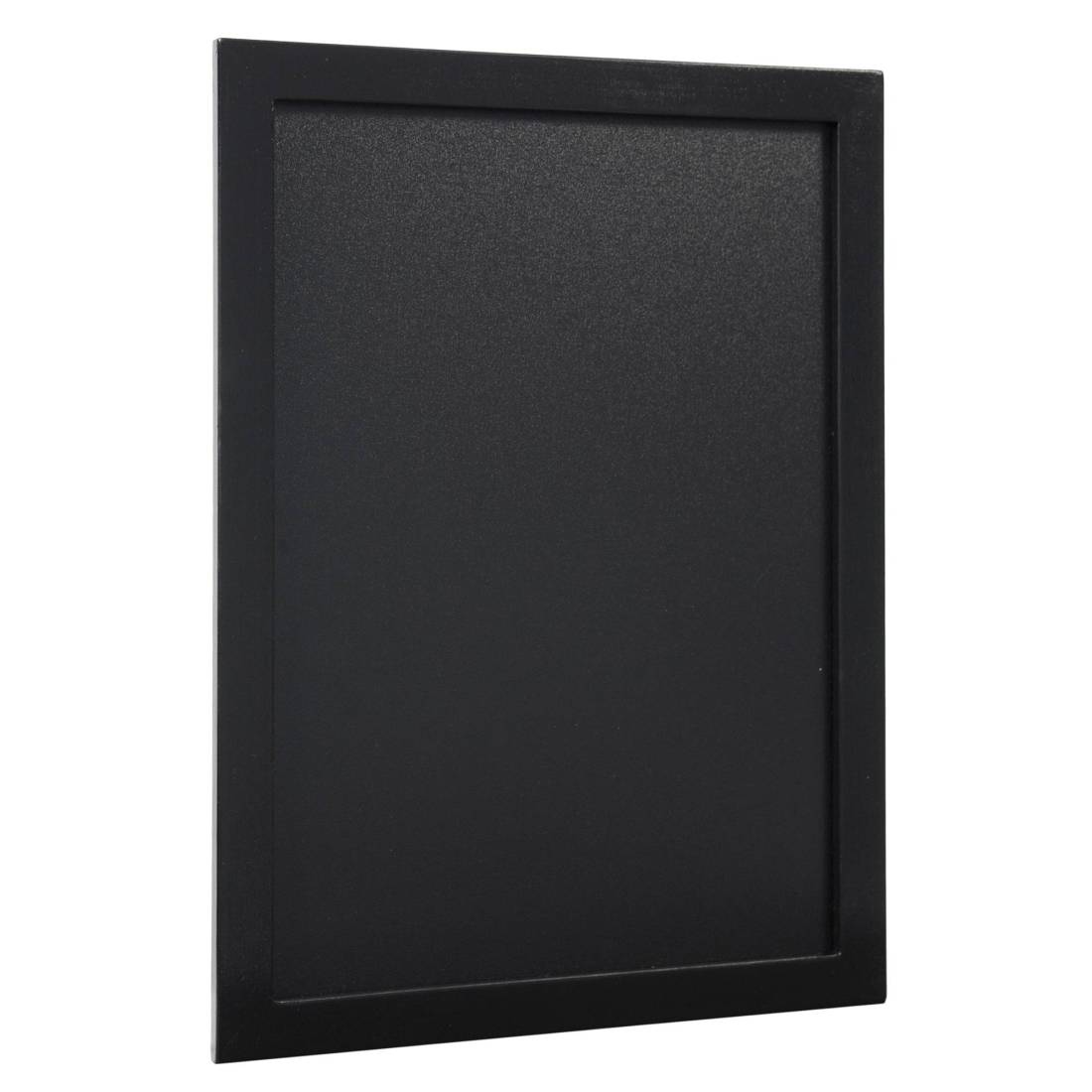Lavagna di qualità con cornice in legno laccato nero L2cm H1cm. Fondo lavagna nera in resina melaminica da 4mm. Adatta per uso interno e esterno.Superficie di scrittura doppia, non porosa, antigraffio, antiuro e resistente ai raggio UV. Fornita con kit di mo ntaggio a parete e 1 pennarello a gesso liquido bianco.