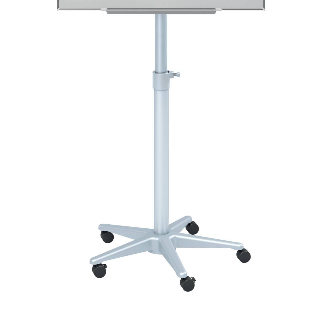Portablocco mobile su base a 5 ruote con superficie in acciaio laccato 100x67,5cm, magnetica scrivibile. Barra fermafogli a ribalta e vaschetta porta accessori in metallo. Ganci portablocco regolabili per adattarsi a blocchi di ogni formato. Altezza regolabile.