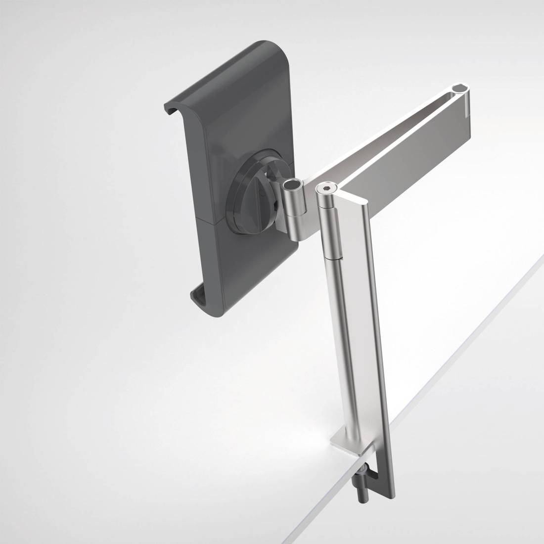 Porta Tablet da banco. Adatto a tablet da 7” a 13”; Realizzato in materiali e finiture di altissima qualità; Inserimento e rimozione del tablet con una sola mano; Orientabile a 360° e posizionabile in orizzontale o verticale; Ergonomia assicurata dall’ampio angolo di visualizzazione; Robusto e stabile, con dispositivo anti-furto KSS; Sistema di cablaggio integrato; Design elegante e moderno, adatto ad ambienti formali.