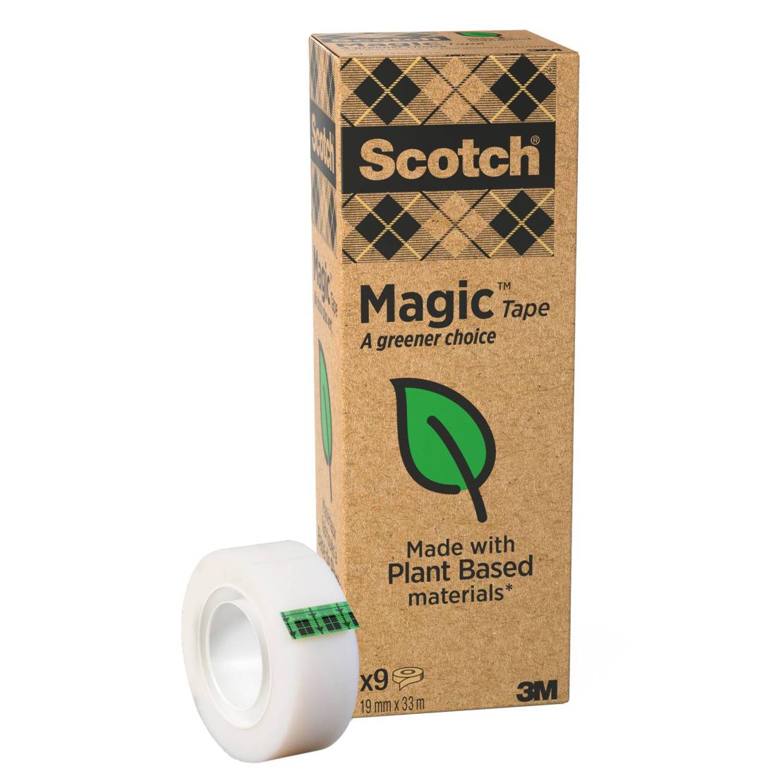 Value Pack 9 rotoli di Scotch Magic 900 con dispenser in plastica riciclata. Nastro realizzato con fibre naturali e adesivo a base d'acqua senza solventi.