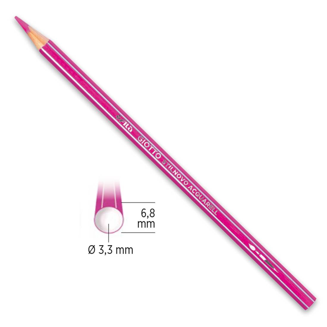 Pastello a sezione esagonale 6,8mm, verniciato nel colore della mina con spigoli argentati e bottone argento. Lunghezza 18cm. Mina acquerellabile 3,3 mm. Colori ricchi ed intesi che si acquerellano perfettamente e con facilità al contatto con l’acqua. Disponibile in 36 colori.