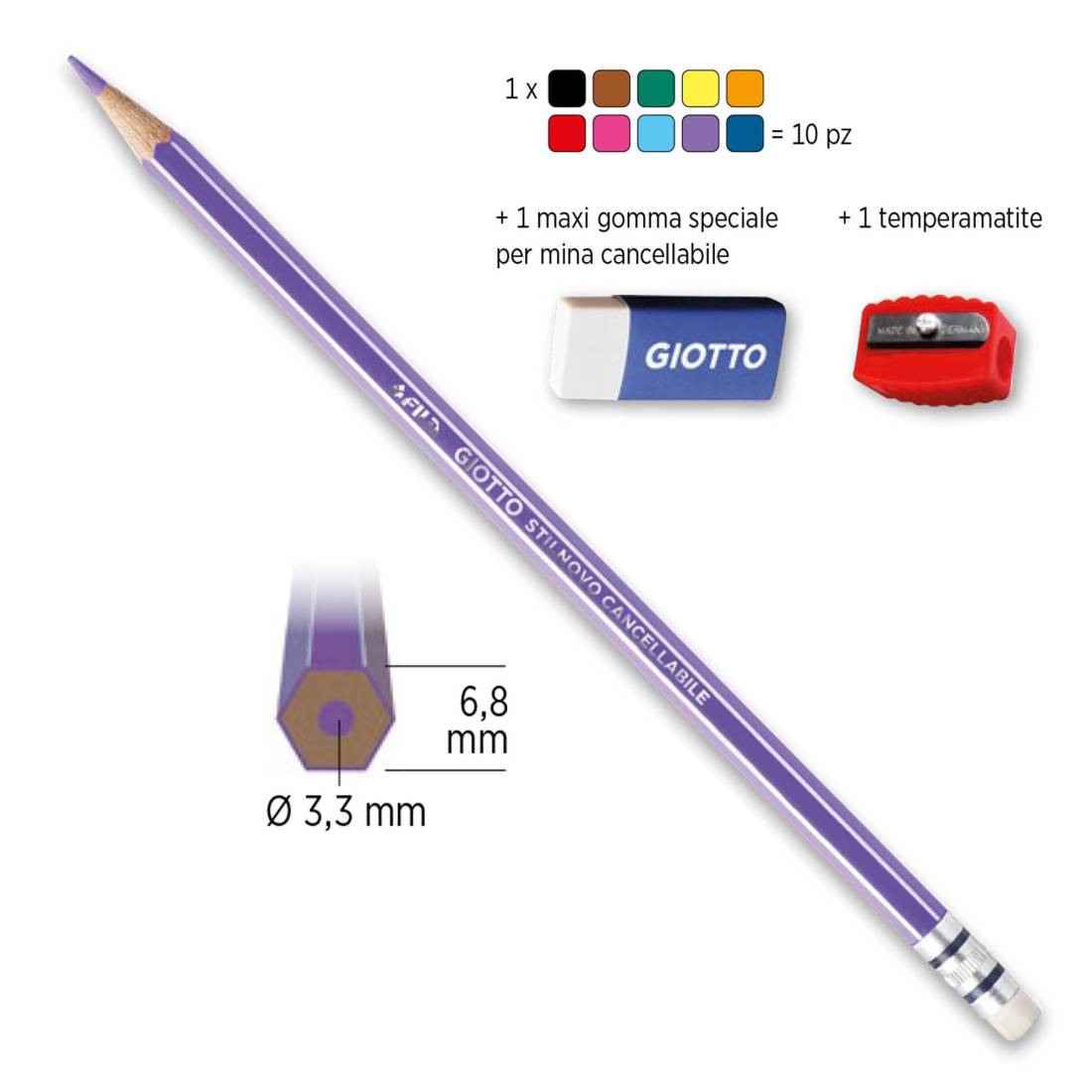 Il pastello Stilnovo con mina cancellabile. Ideale per scrivere, colorare e sottolineare. 10 colori ognuno con gomma + una maxi gomma e un temperamatite. Pastello a sezione esagonale 6,8mm, verniciato nel colore della mina con spigoli argentati. Mina cancellabile 3.3 mm di ottima qualità e resa. Facile da temperare.