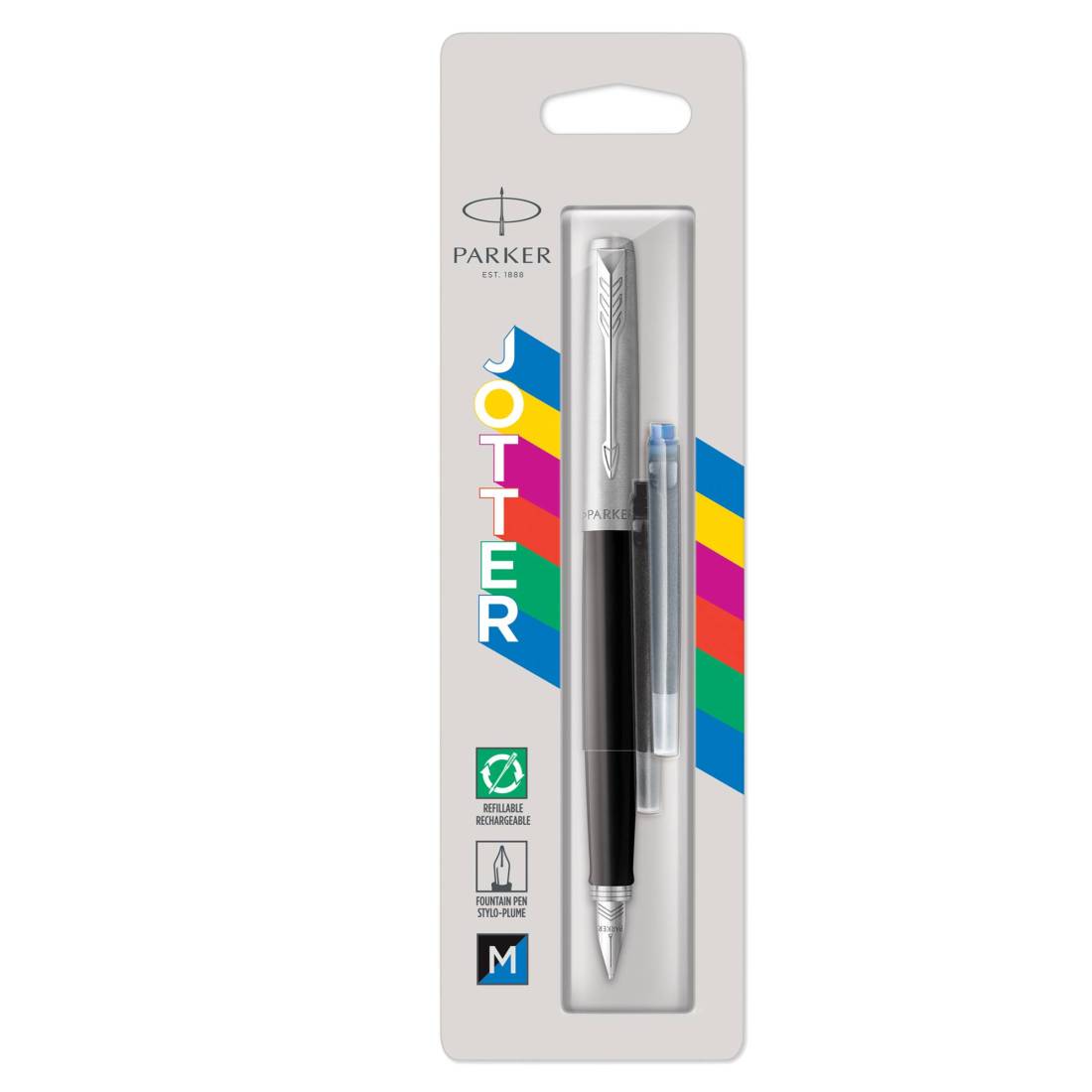Penna stilografica con cappuccio e clip in acciaio inox. Fusto in plastica colorato lucido. Incluso due cartucce, una ricarica Quink nera e una blu.