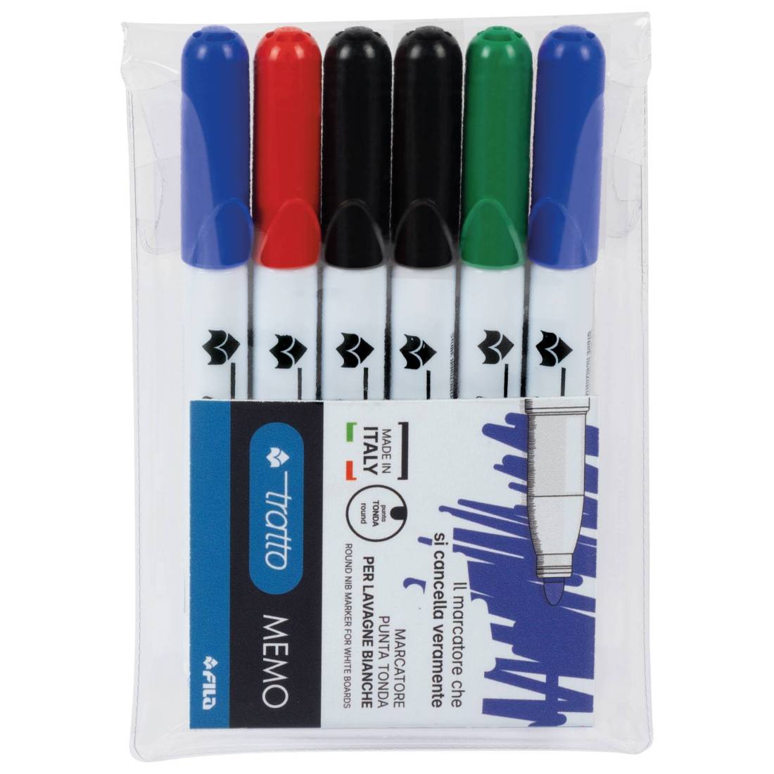 TRATTOMarcatore punta tonda 4mm con inchiostro cancellabile a secco per lavagne bianche. Colori brillanti e ottima cancellabilità. Odore neutro. Astuccio da 6 pennarelli in colori assortiti: 1x blu, 1x rosso, 1x verde, 1x viola, 2x nero.