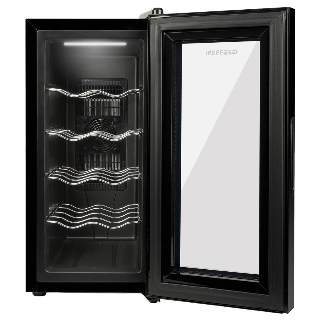 No BrandRiservetta, frigorifero super silenzioso con funzionamento a semiconduttore, è la soluzione ideale per conservare fino a 10 bottiglie sempre a temperatura perfetta. Dotato di doppia cella di Peltier e di pareti ben isolate, è in grado di raggiungere basse temperature anche quando opera in ambienti molto caldi. Equipaggiata con controllo elettronico della temperatura, display LED con comandi soft touch e luce interna, Riservetta è un prodotto particolarmente ecologico, dato che consuma solo 75 kWh all’anno e che il suo funzionamento non prevede l’utilizzo di gas refrigerante. Capacità 10 bottiglie (28L) Display LED con comandi touch Sistema di raffreddamento senza compressore e gas refrigerante 2 celle di Peltier e 2 ventole di raffreddamento Basso consumo energetico: 65W/75 KWh anno Classe energetica E Funzionamento super-silenzioso: 35dBA Termostato regolabile da 8°C a 18°C Luce interna 4 ripiani in acciaio cromato Potenza: 65W Alimentazione: AC 100-240V ~ 50-60Hz Dimensioni (L x H x P): 26 x 56.7 x 51.5 cm Peso: 12.7 Kg