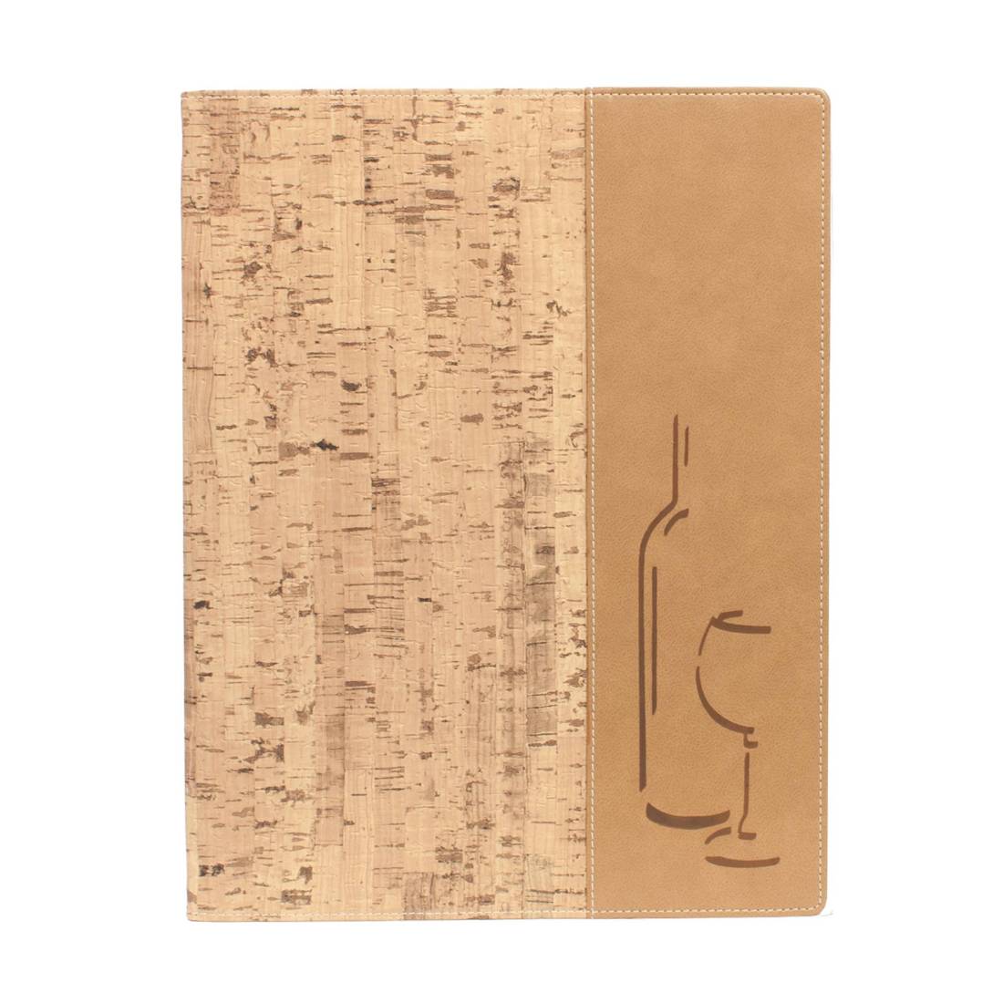Porta menu' in sughero dal design sofisticato. flessibile, pregiato, resistente e facile da pulire. Comprende 1 inserto doppio interno (per 4 fogli) in plastica trasparente, trattenuto da un elastico sul dorso. La linea comprende anche la carta dei vini.