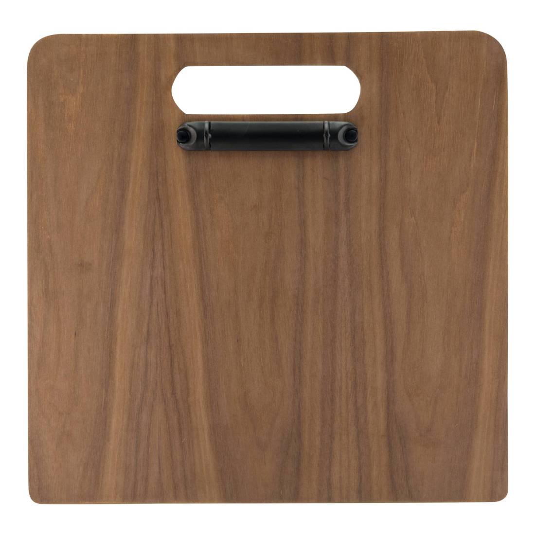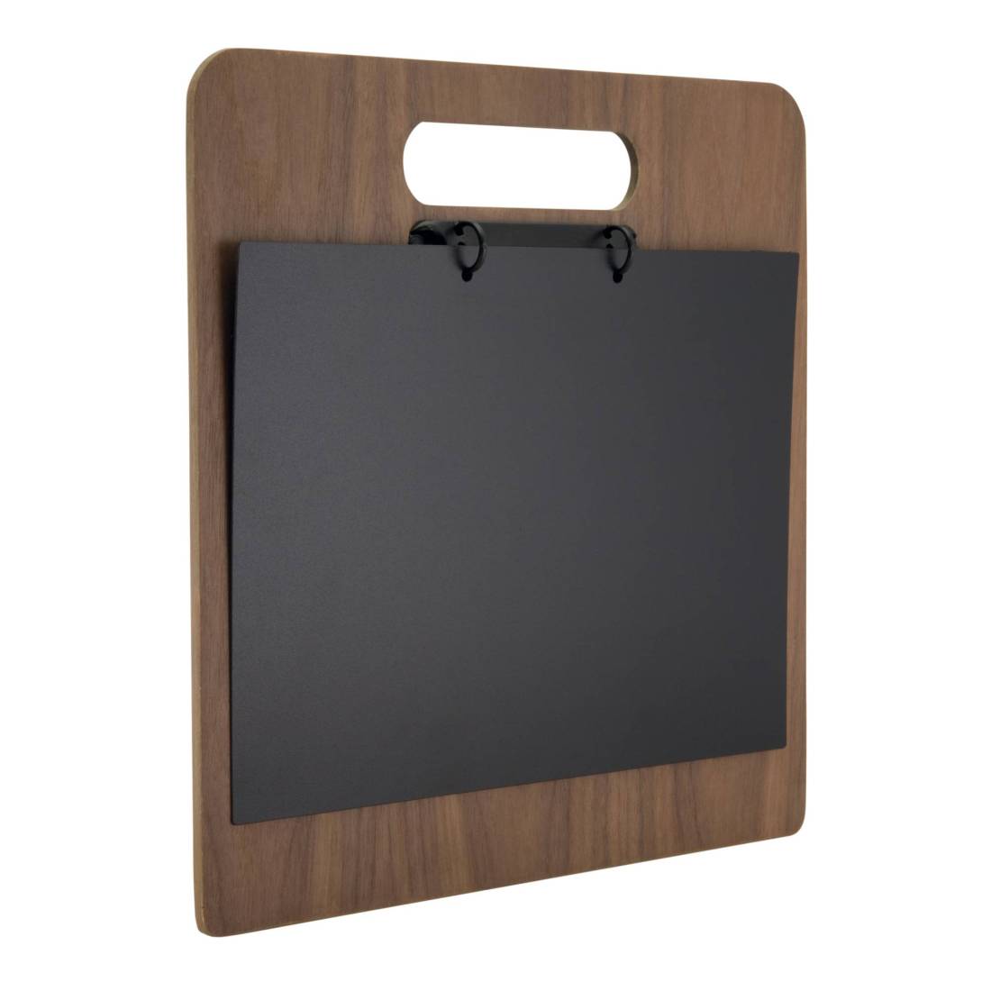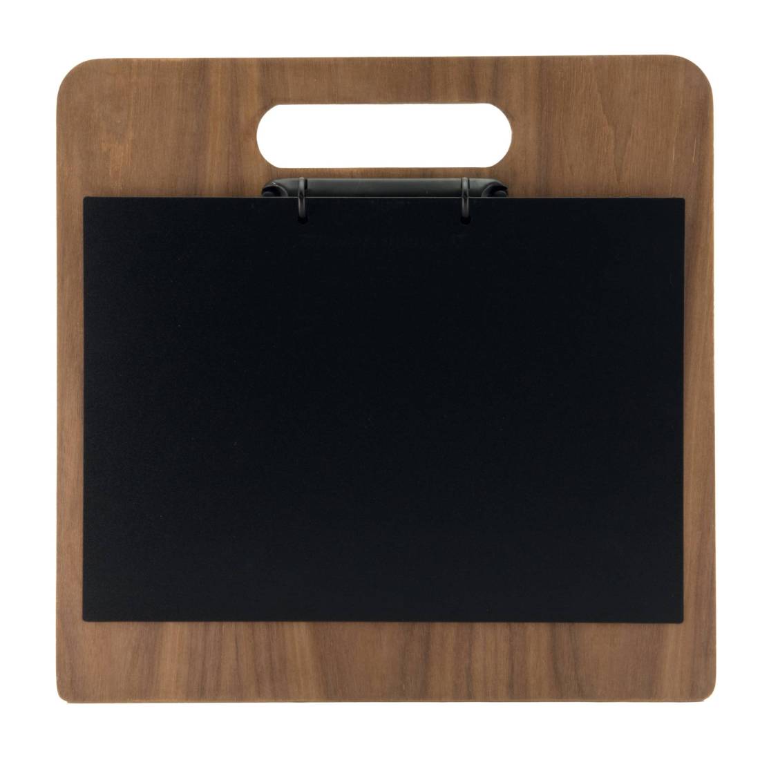 Porta menù in legno a tagliere con 2 anelli in metallo laccato nero. Completo con lavagnetta sottile nera scrivibile e utilizzabile come copertina del menù. Pennarello incluso. Dimensioni: 32,7x30x2,6cm.