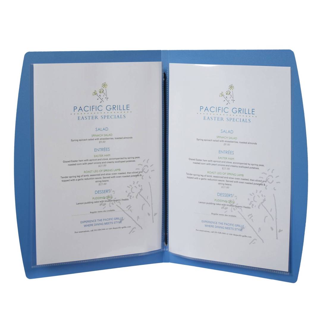 Porta menù colorato ed ecologico dal design semplice e fresco! Realizzato in polipropilene antimacchia e antigraffio con etichetta in acciaio inox. Resistente ai raggi UV. Comprende 1 inserto doppio interno (per 4 fogli) in plastica trasparente, trattenuto da un elastico sul dorso. Può contenere fino a 10 inserti doppi per un totale di 40 facciate.