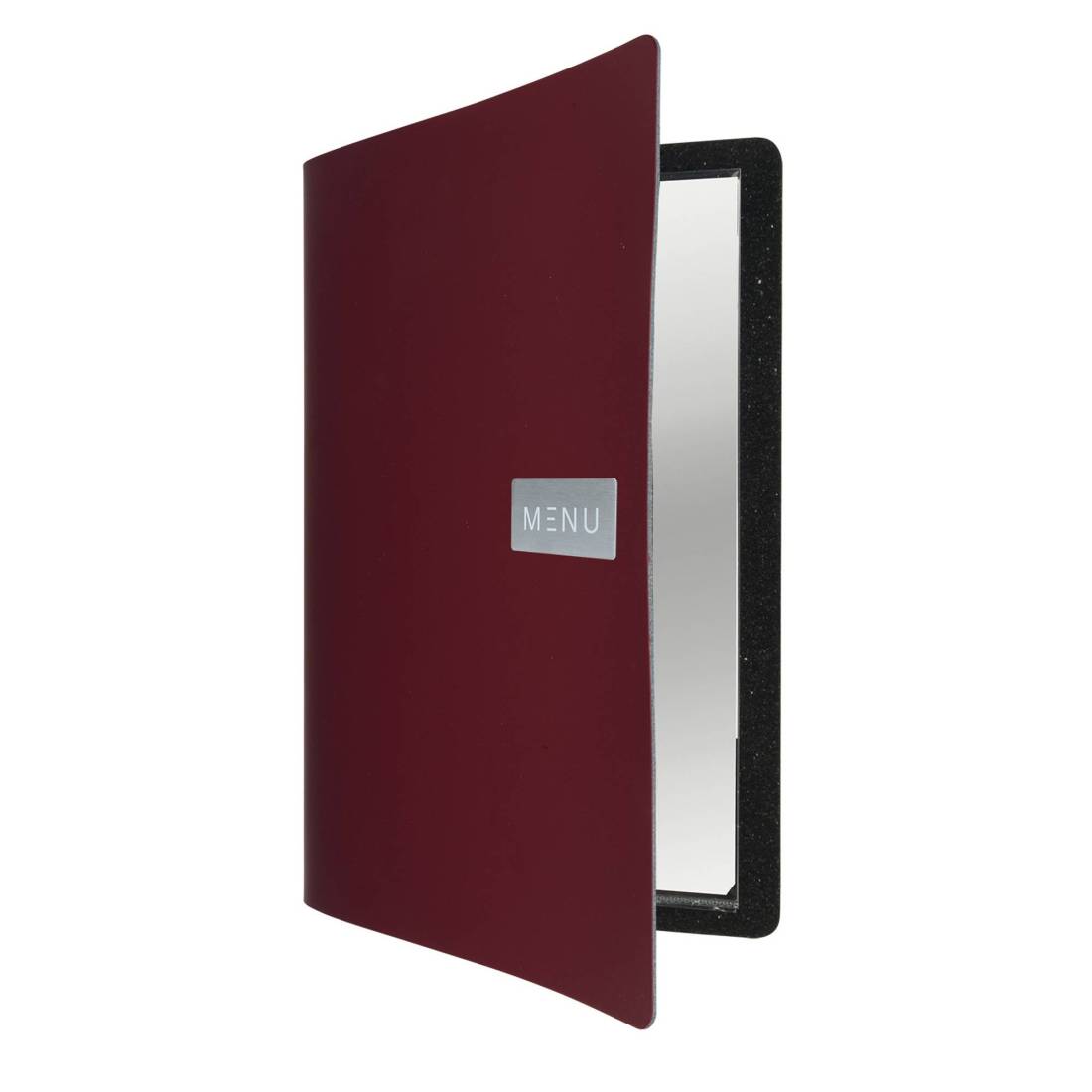 Porta menù in pelle ecologica, flessibile e facile da pulire. La placca in metallo stampato lo rende particolarmente elegante. Comprende 1 inserto doppio interno (per 4 fogli) in plastica cristallo, trattenuto da un elastico sul dorso. Ogni porta menù è fornito con una targhetta metallica extra da personalizzare con il proprio logo. Dimensioni: 24 x 33cm. Può contenere fino a 10 inserti doppi per un totale di 40 facciate.