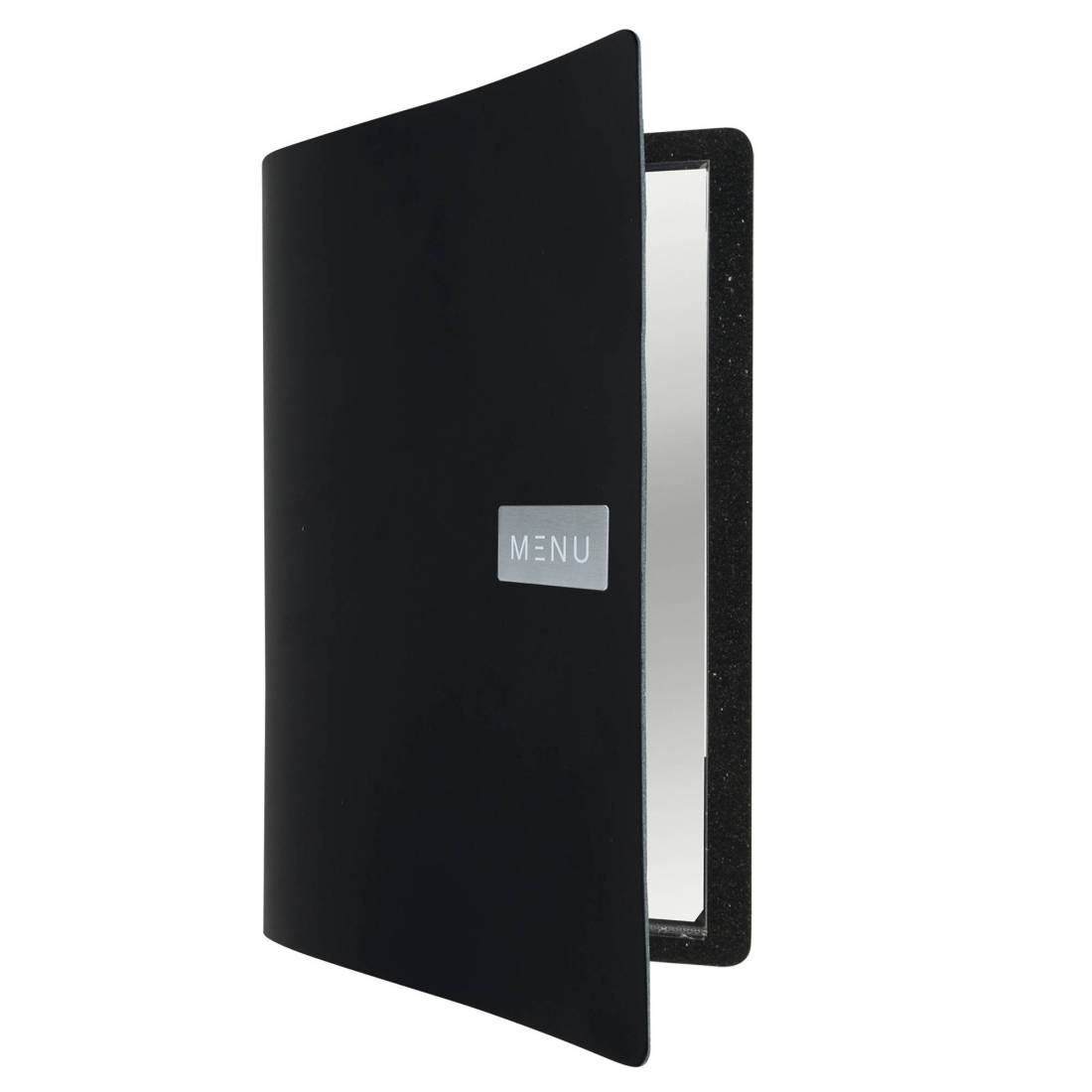 Porta menù in pelle ecologica, flessibile e facile da pulire. La placca in metallo stampato lo rende particolarmente elegante. Comprende 1 inserto doppio interno (per 4 fogli) in plastica cristallo, trattenuto da un elastico sul dorso. Ogni porta menù è fornito con una targhetta metallica extra da personalizzare con il proprio logo. Dimensioni: 24 x 33cm. Può contenere fino a 10 inserti doppi per un totale di 40 facciate.
