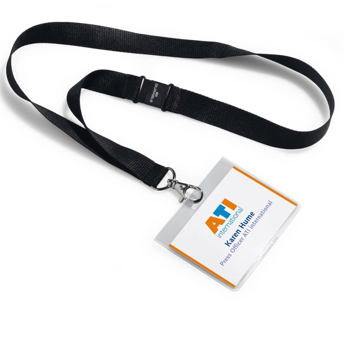 Portanome con cordoncino in tessuto nero da 20mm (lunghezza 44cm) dotato di sgancio antisoffocamento e moschettone in metallo. Una volta agganciato evita la fuoriuscita accidentale dell'inserto. Fornito con inserto in cartoncino personalizzabile con il software DURAPRINT®.