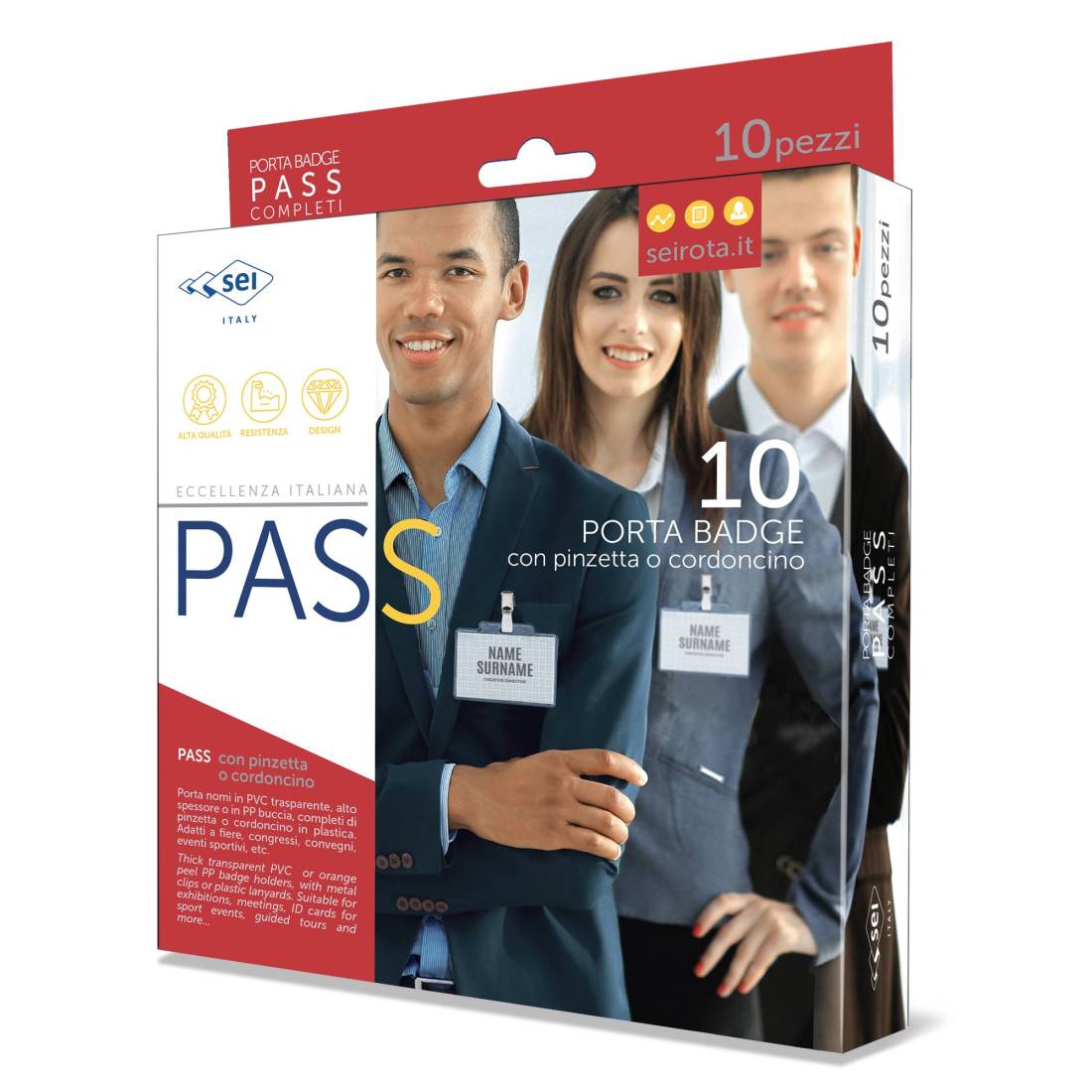 SEI ROTAPorta nomi in PP a buccia completi di pinzette in metallo (a pinza), ma senza cartoncino. Apertura lato corto (laterale) Adatti a congressi, riunioni, visite guidate. Formato 95x60mm.