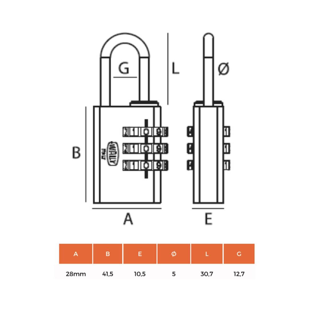 METALPLUSLucchetti dal corpo in ottone e arco in acciaio tempreto. Combinazione a a 4 pomelli. Confezione in blister. Dimensione: H 41,5 x L 28mm, Altezza complessiva (arco incluso) 69,5mm
