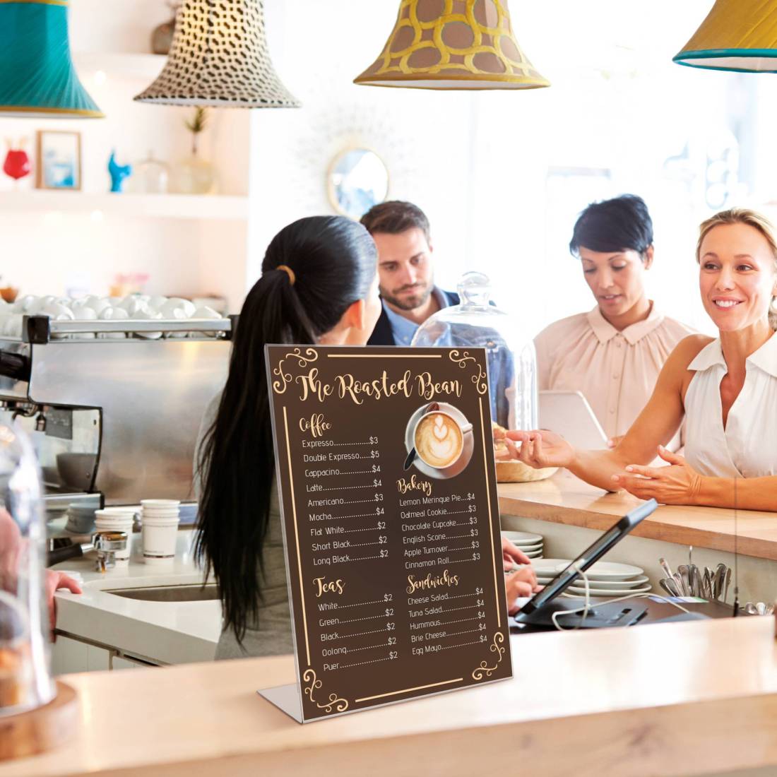 Display in PET trasparente (materiale riciclabile) idoneo al contatto con gli alimenti. Ottima resistenza agli urti e al fuoco. Ideale per ogni tipo di comunicazione e perfetto come porta menù o porta listino. Portadepliant con base a L utilizzabile sia in verticale che orizzontale. Formato 1/3 A4 - 10x21cm - spessore 1,5mm.