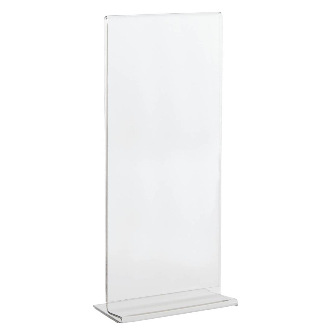 Display in PET trasparente (materiale riciclabile) idoneo al contatto con gli alimenti. Ottima resistenza agli urti e al fuoco. Ideale per ogni tipo di comunicazione e perfetto come porta menù o porta listino. Portadepliant con base a T formato 1/3 A4 - 10x21cm - spessore 1,5mm.