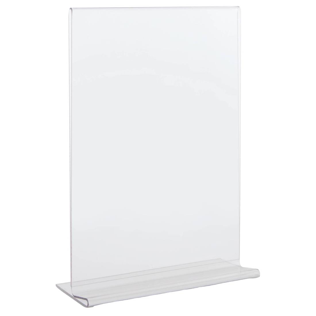Display in PET trasparente (materiale riciclabile) idoneo al contatto con gli alimenti. Ottima resistenza agli urti e al fuoco. Ideale per ogni tipo di comunicazione e perfetto come porta menù o porta listino. Portadepliant con base a T formato A5 - 15x21cm - spessore 1,5mm.