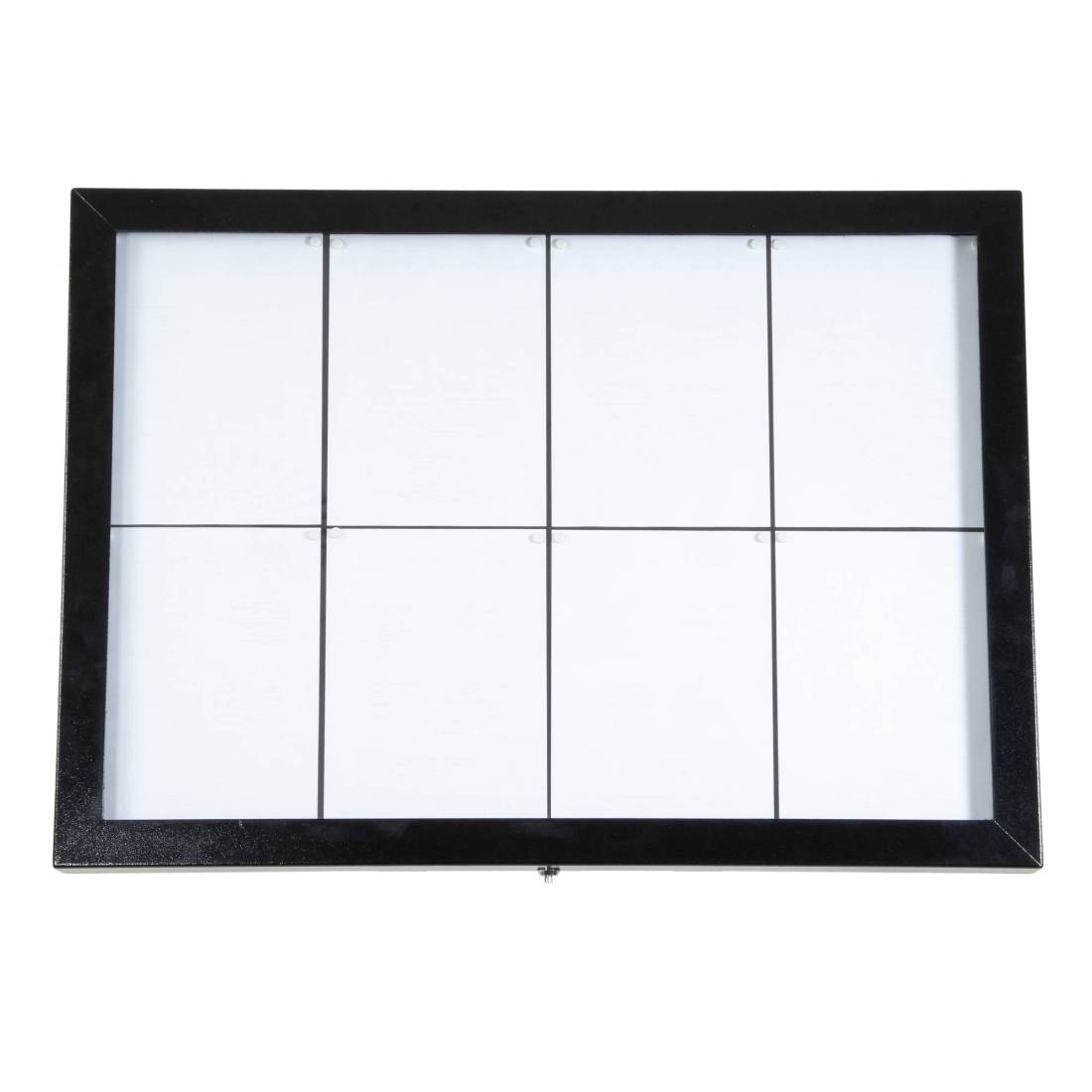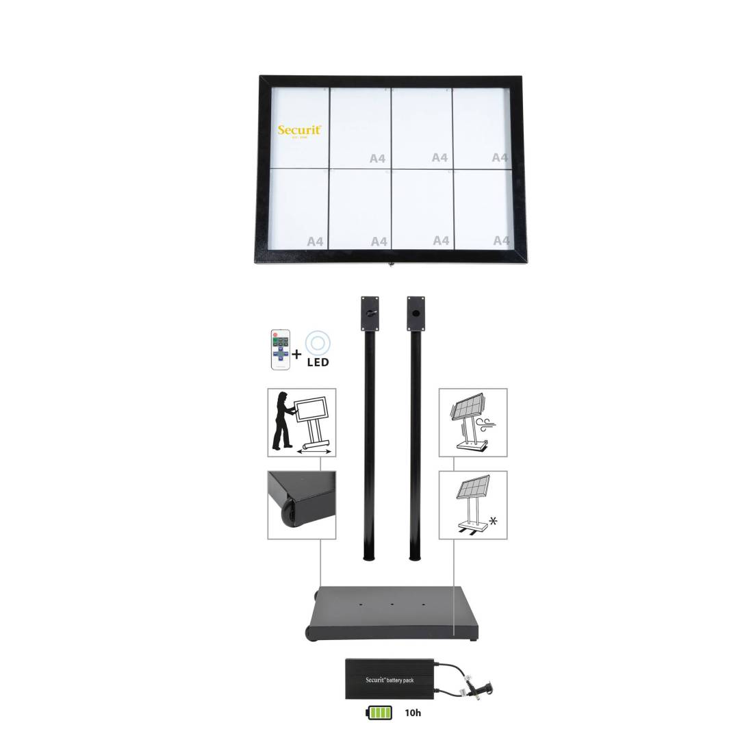 Espositore in acciaio battuto colore nero. Resistente alle intemperie, chiusura con chiave. Illuminata internamente da luci a LED bianche. Telecomando, e cavo da 5 metri inclusi. Pannello metallico e magneti all’ interno. Può esser agganciato al muro (kit di montaggiio incluso) o posizionato sulla solida base a due piedi di 110cm con ruote acquistabile separatamente. Formato contenuto: 8xA4.