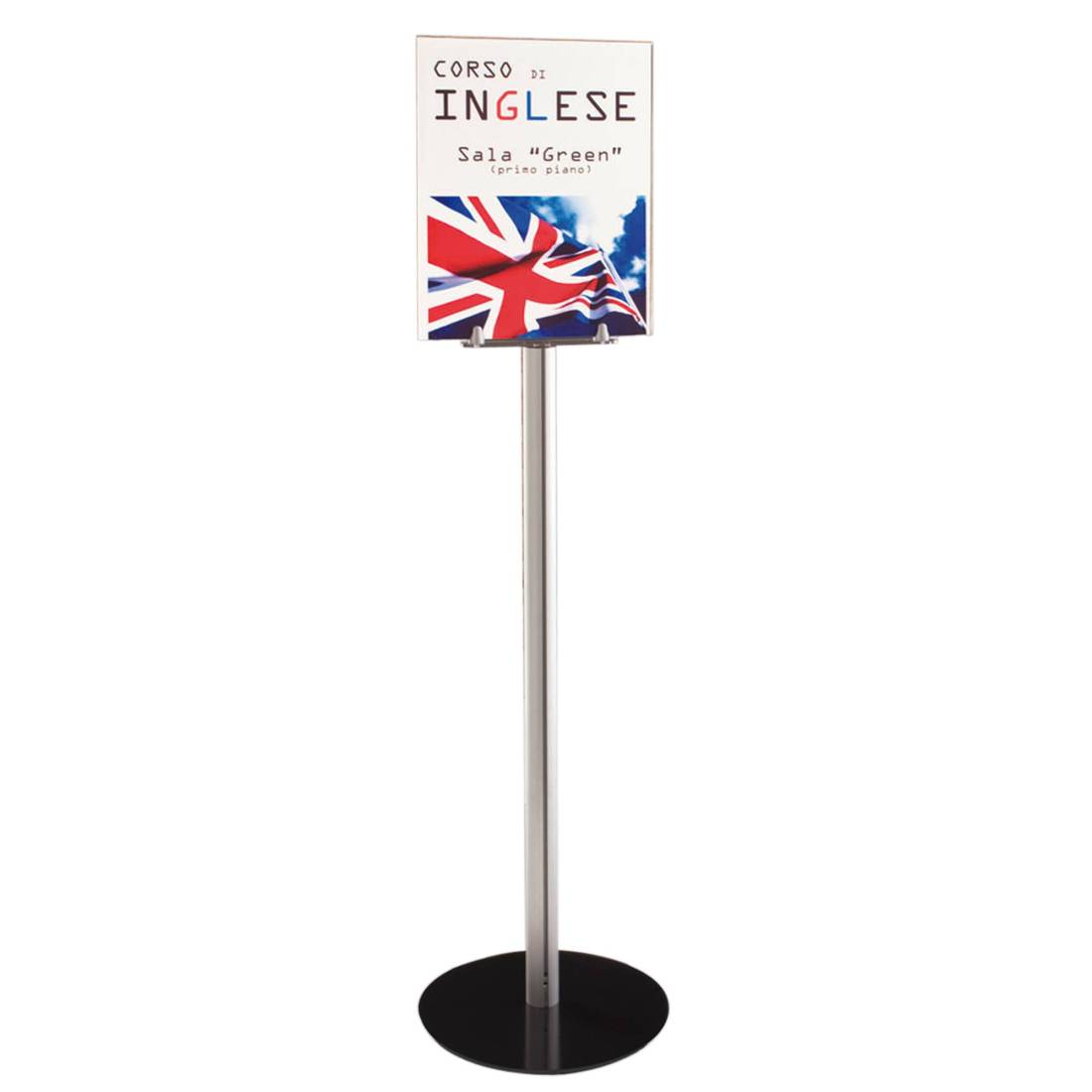 TECNOSTYLSupporto in alluminio per segnaletica da pavimento, con base in metallo colore grigio canna di fucile e porta avvisi in metacrilato. Dimensioni °32 x 138cm.