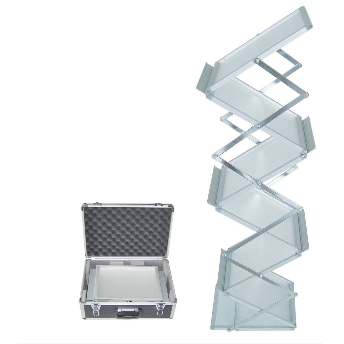 STUDIO TEspositore ideale per essere trasportato, poichÚ ripiegabile. realizzato in alluminio anodizzato con 5 ripiani in plexiglass satinato formato a4. Dotato di fermo di sicurezza al piede per garantire stabilitÓ all'espositore quando aperto. La struttura ripiegata Þ contenuta in un'elegante valigetta. 31x28x135cm - 5 ripiani a4