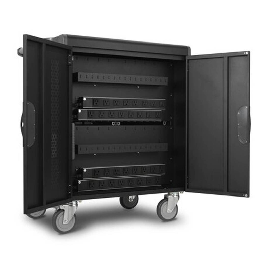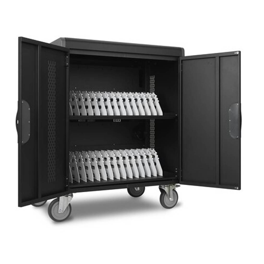 Armadietto di sicurezza Per la ricarica, il trasporto, il blocco e la conservazione comode e semplici di max. 32 dispositivi (fino a 15,6” ciascuno). Le funzioni comprendono porte anteriori e posteriori bloccabili e un anello di attacco per il cavo di sicurezza (lucchetti e cavo di sicurezza non inclusi), separatori e organizzazione cavo integrati che non necessitano della presenza di ingombranti cavi, rotelle girevoli bloccanti da 5” che non lasciano segni e consentono un semplice spostamento su superfici sterrate e irregolari, tecnologia di ricarica intelligente che dà automaticamente priorità ai dispositivi che ne hanno più bisogno e una ricarica più efficiente. È inoltre dotato di una maniglia.