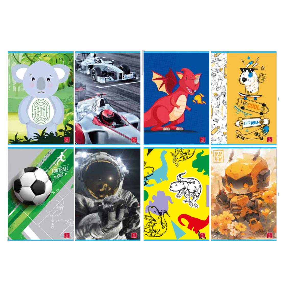 Maxiquaderno rilegato con punto metallico. Copertina in cartoncino da 205gr verniciatura UV. Risguardo personalizzabile stampato fronte e retro. Fantasie assortite 2023.