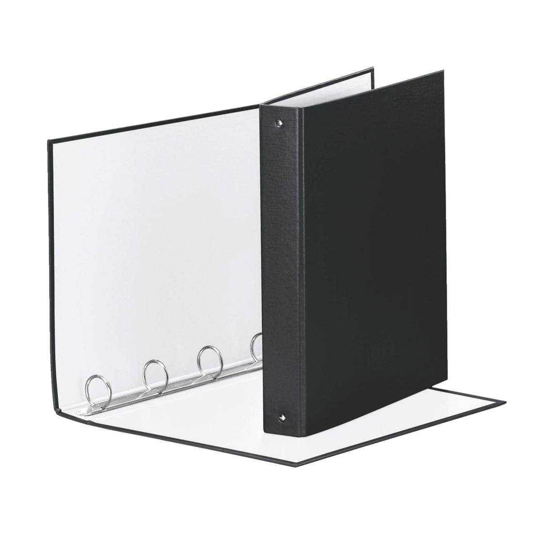 Raccoglitore in robusto cartone da 2 mm di spessore rivestito in polipropilene (bianco internamente). Solidità e affidabilità dei materiali rendono il prodotto ideale per un uso intensivo domestico o in ufficio, mentre il rivestimento fornisce eleganza e gradevolezza al tatto. Meccanismo a 4 anelli tondi (diametro 30 mm). Formato utile 22x30 cm. Dimensioni esterne 27,5x31,5x4,5 cm. Capacità 200 fogli (da 80 gr/mq). Colore nero.