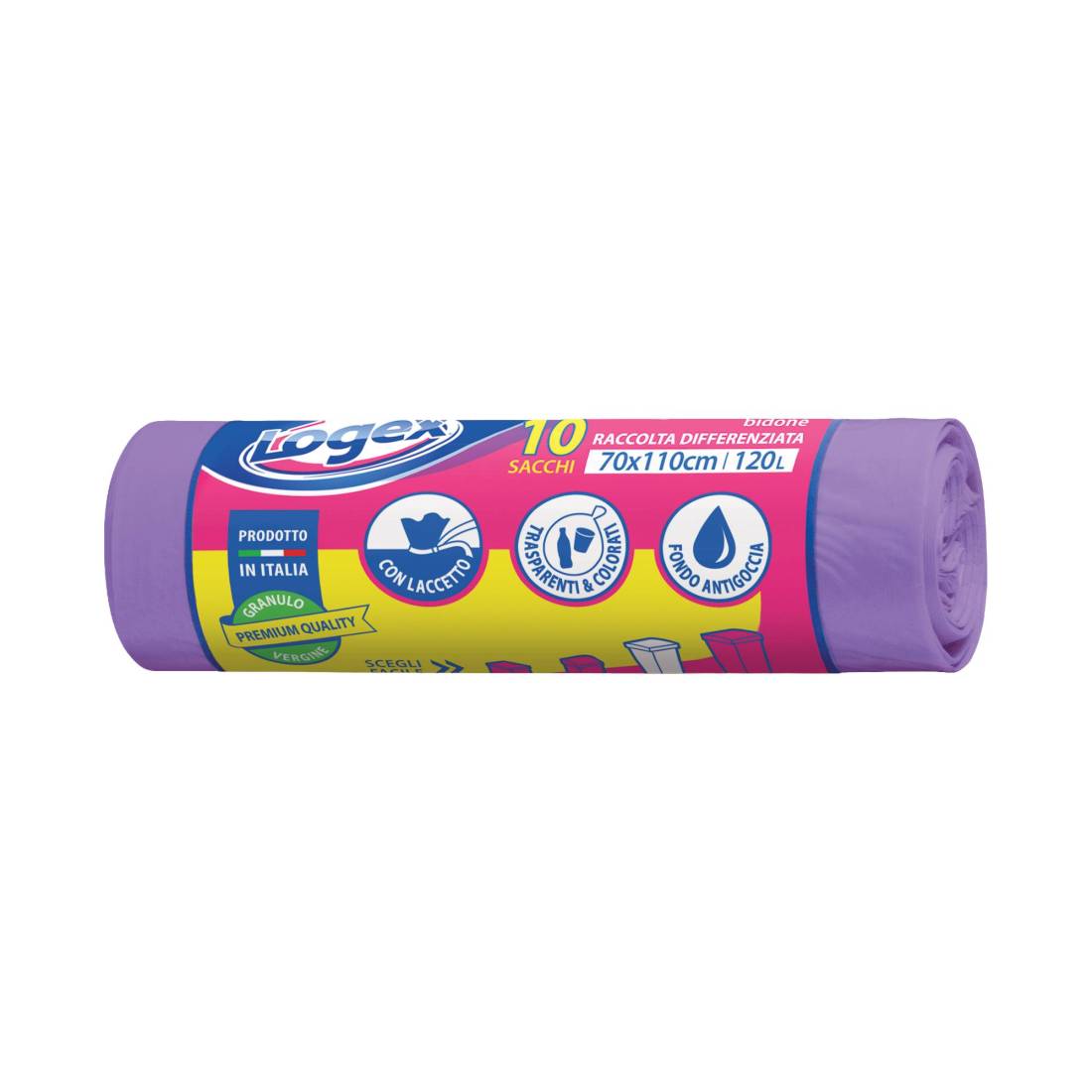 Sacchi per immondizia - 70x110 cm - 120 L - 16 micron - viola - Logex Professional - rotolo da 10 sacchetti