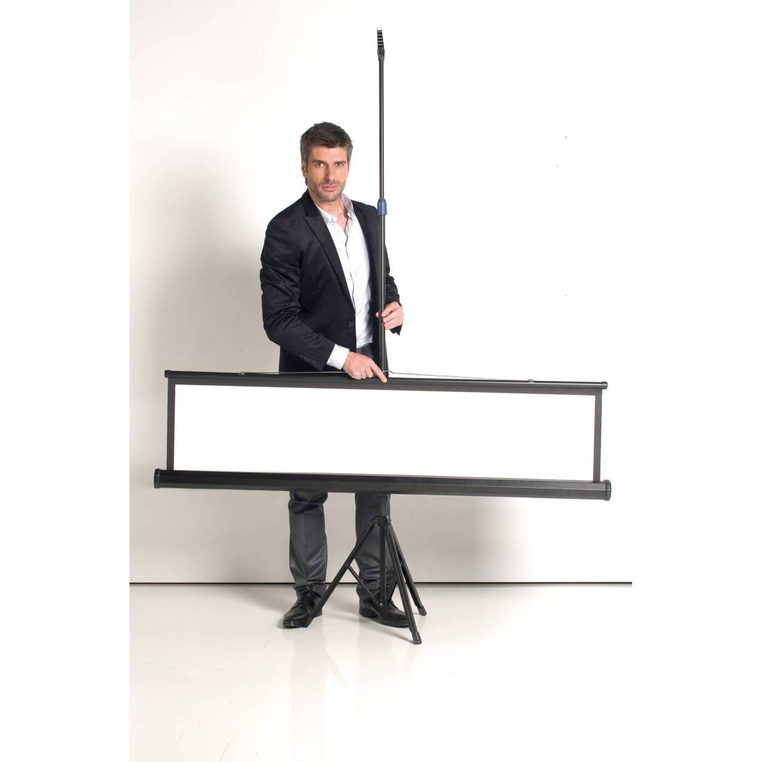 Schermi per proiezione con treppiede in formato quadrato con retrazione manuale a molla. Superficie di proiezione bianco opaco. Offre una riflettività superiore e una superficie piatta. Ideali per tutti i proiettori frontali. Dimensioni: 150x150cm.