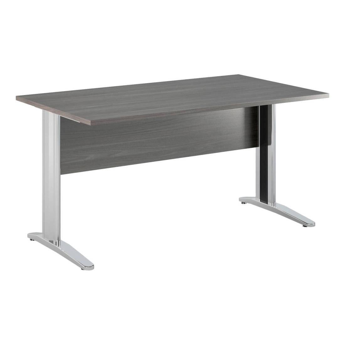 Scrivanie con dimensioni conformi alle normative sulla sicurezza dei posti di lavoro in ufficio. Bordatura dei piani in ABS 2mm antishock ed assenza di spigoli vivi. Le scrivanie sono disponibili nella versione con fianchi pannello in melaminico (sp. 22 mm) o con fianchi in metallo ad L verniciati effetto cromo completi di piedini regolabili in altezza e canalina passacavi ispezionabile. Dimensioni: L140 x P80 x H72cm