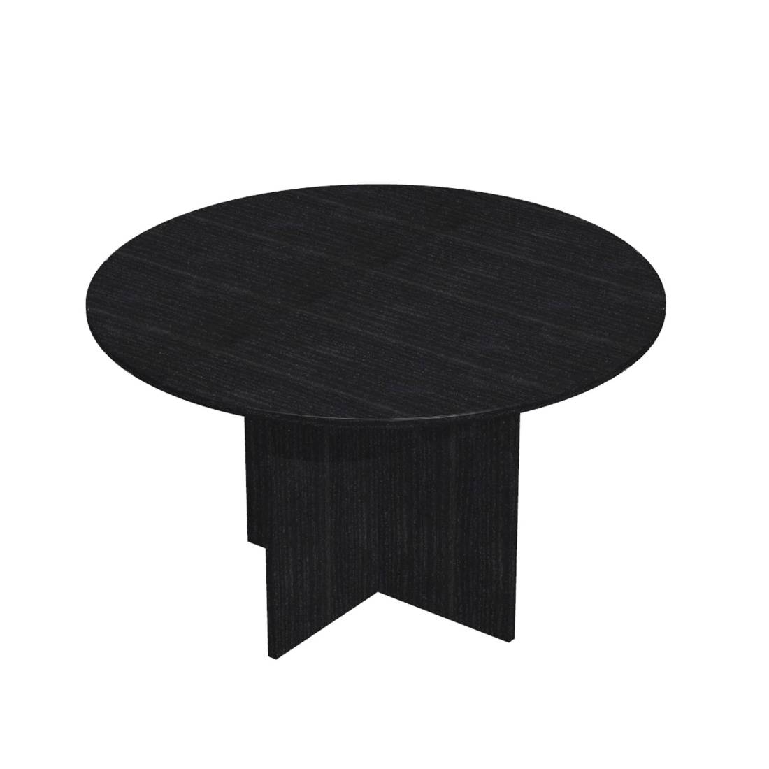 TAVOLO RIUNIONE tondo da 4 POSTI Ø120 x H72cm. Realizzato in melaminico spessore 22 mm, certificato classe E1. Piani bordati con profili antiurto sagomato, gambe in melaminico sp. 22 mm e piedini regolabili per la massima stabilità.