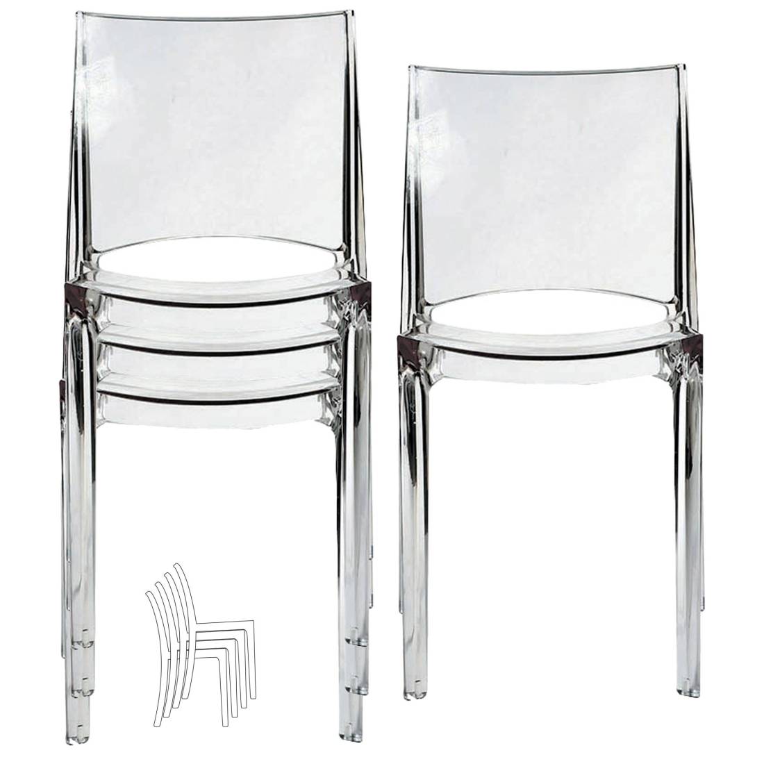 Adatta a tutti gli stili e a tutti gli ambienti, implica un vero risparmio di spazio perché è impilabile. In policarbonato trasparente. Dimensioni: L48xH81,5xP50cm. Altezza seduta: 44,5 cm.