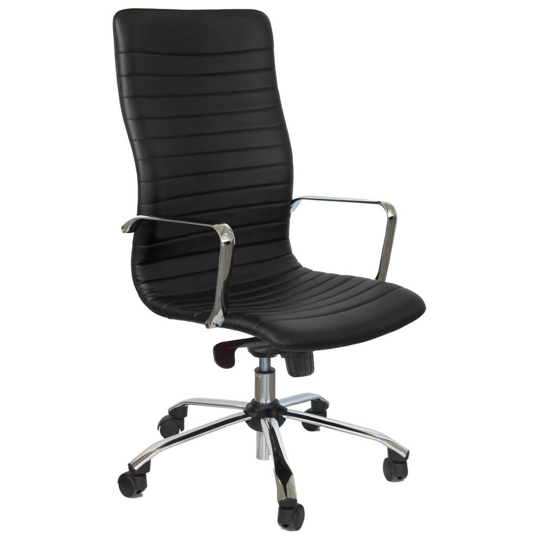 Poltrona direzionale girevole - sedile e schienale in multistrati di legno - elevazione a gas - meccanismo oscillante con blocchi - base e braccioli in acciaio cromato. Rivestimento seduta in tessuto "PLUS - Eco Leather" idrorepellente, facile da pulire, senza flatati e flame retardant. Braccioli inclusi (non rimovibili). Alt.tot.: 108-117cm; Prof.tot.: 70cm; Alt.schienale: 66cm; Larg.schienale: 50cm; Larg.seduta: 50cm; Prof.Sedile: 48cm; Altezza sedile: 44-54cm.