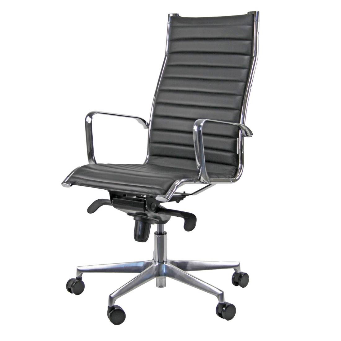 Poltrona direzionale girevole con elevazione a gas - meccanismo oscillante con 4 blocchi anti shock con fulcro avanzato; Rivestimento seduta in "TOP - vera pelle smerigliata". in fibra modacrilica e reazione al fuoco classe 1. Schienale alto e base in acciaio. Meccanismo oscillante con fulcro avanzato. Braccioli in acciaio cromato inclusi (non rimovibili) ed elevazione a gas. Altezza totale: 105-116cm; Profondità tot: 68cm; Alt. schienale: 60cm; Larghezza schienale: 48cm; Larghezza sedile:50cm; Profondità sedile: 50cm; Alt.sedile: 42-54cm.