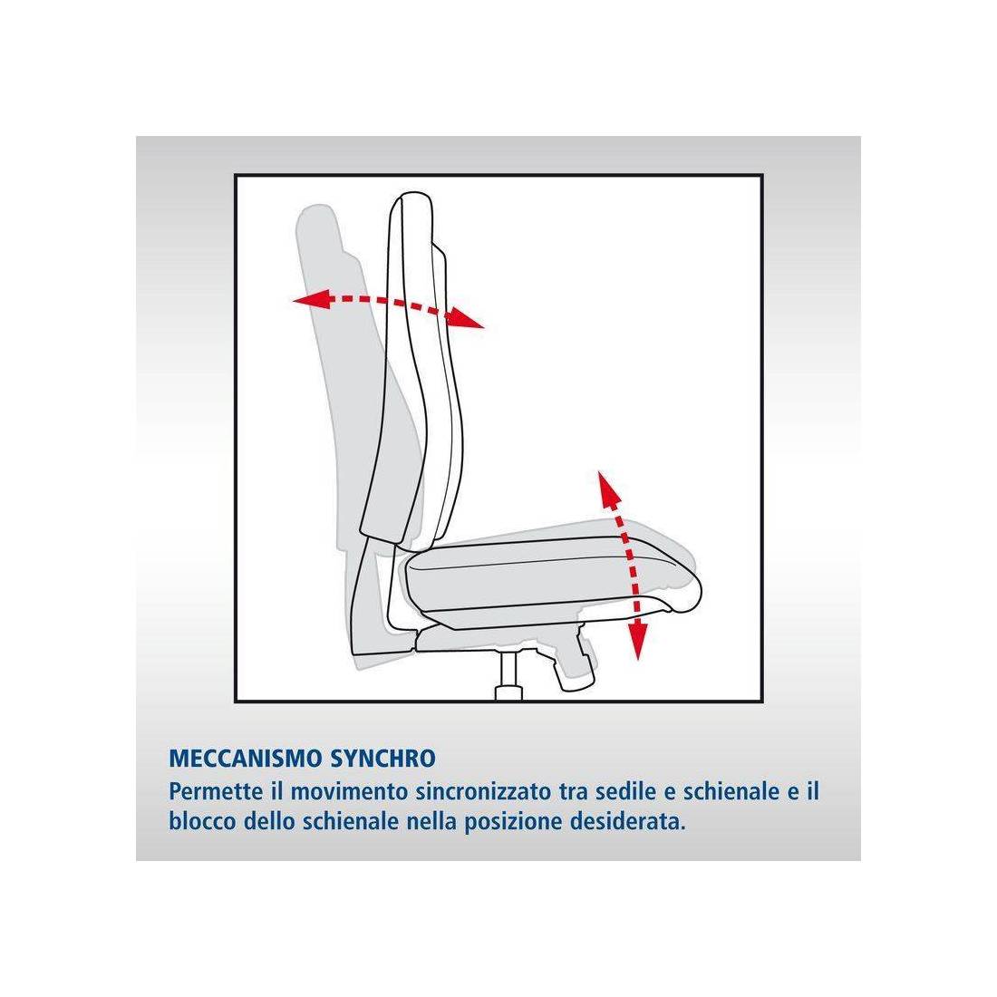 INFORMAZIONI TECNICHE: - meccanismo synchro - rivestimento in tessuto ignifugo e resistente all’usura - ruote autofrenanti - razza in poliammide nera - caratteristici braccioli ad ala inclusi - Conforme alla norma europea EN 1335. Norma presente all'interno della legge 81 e specifica per il comparto sedute.
