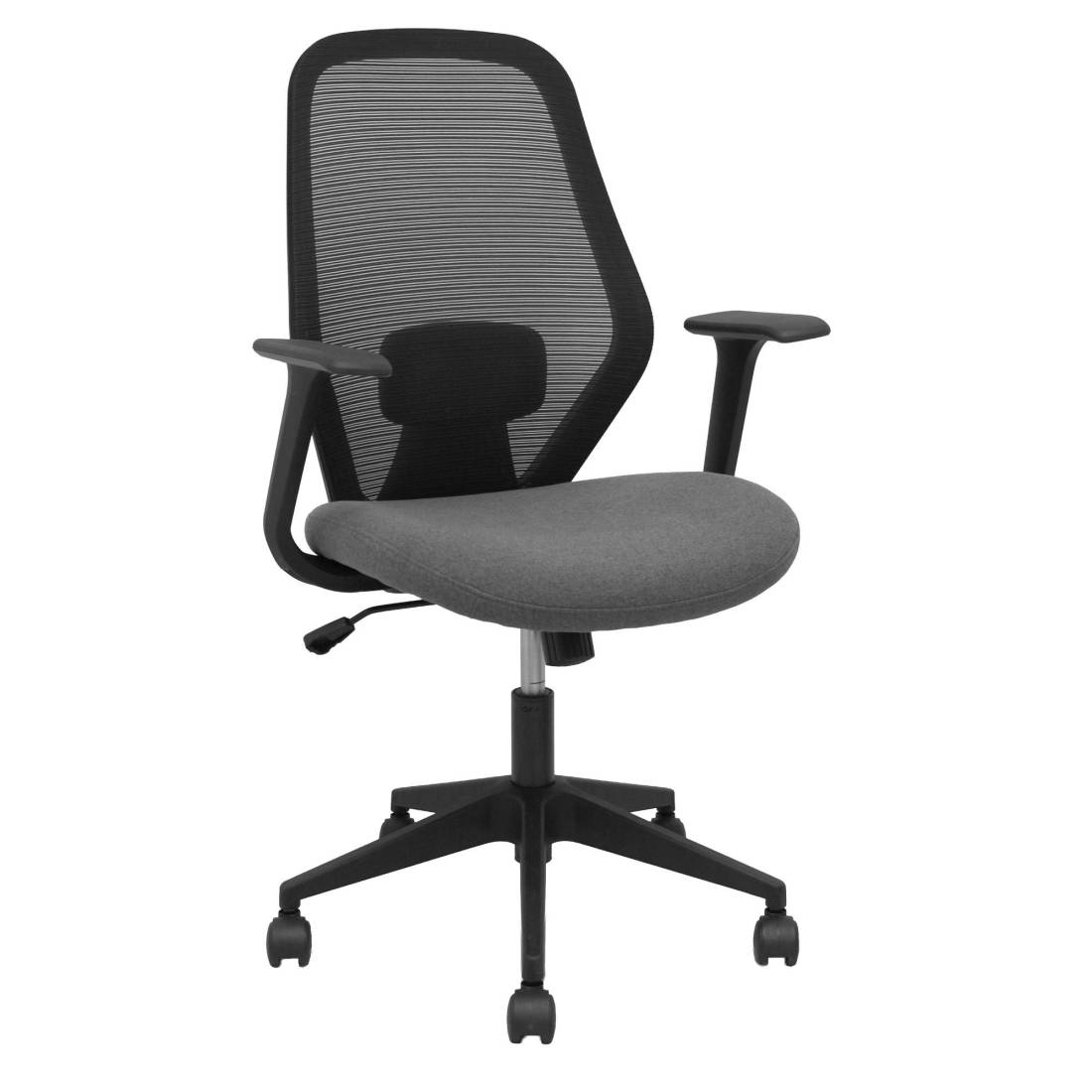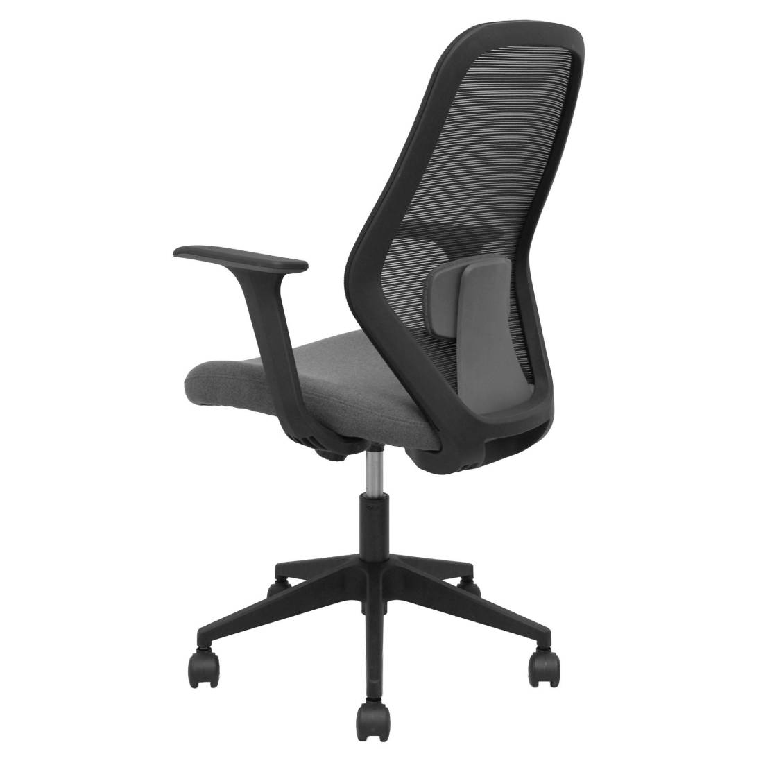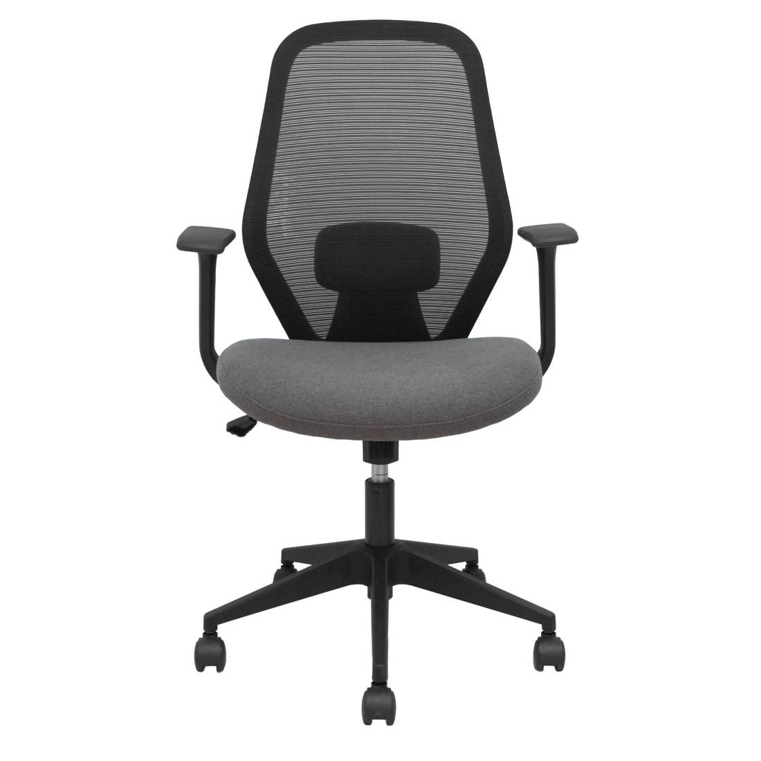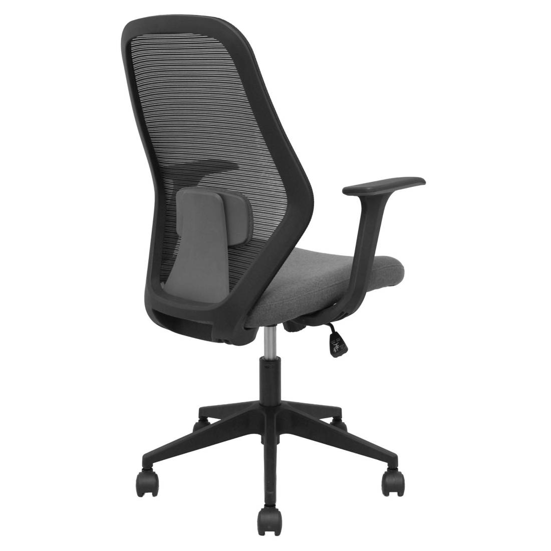 Seduta operativa girevole con palliera in rete e sedile imbottito. Meccanismo basculante, base piramidale e ruote in nylon. Braccioli fissi e supporto lombare. Supporta peso massimo di 120 kg. Altezza: 100-107 cm. Altezza sedile: 47-56 cm. Prof. Sedile: 49,5cm.