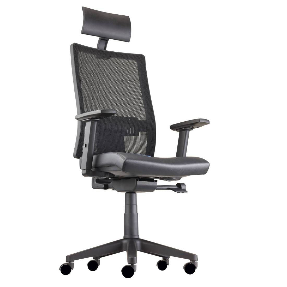 Seduta operativa girevole - elevazione a gas - meccanismo Syncro - 4 blocchi anti shock - meccanismo a contatto permanente - regolazione schienale up-down. Rivestimento seduta in tessuto "PLUS- Eco leather" idrorepellente, facile da pulire, senza flatati e flame retardant. Completa di braccioli regolabili e poggiatesta. Alt.tot.: 122-133cm; Prof.tot.: 68cm; Alt.schienale: 61cm; Larg.schienale: 45cm; Larg.seduta: 50cm; Prof.Sedile: 46cm; Alt. sedile: 42-54cm.