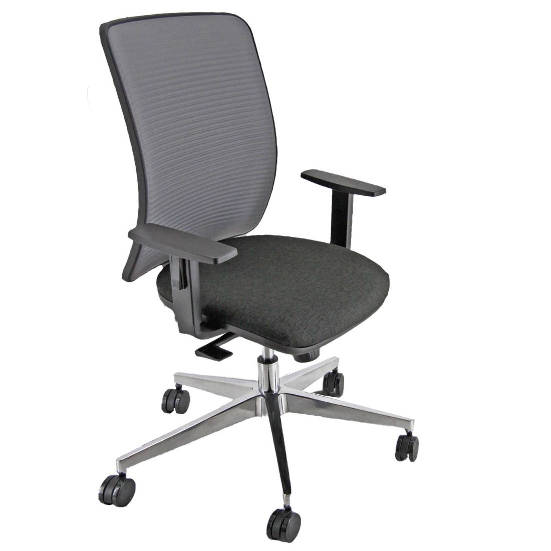 Seduta operativa girevole con elevazione a gas meccanismo synchro con 4 blocchi anti shock meccanismo a contatto permanente - supporto lombare regolabile - base alluminio - rivestimento schienale in tessuto con gel interposto. Rivestimento seduta in tessuto "PLUS - Ignifugo standard" in fibra modacrilica e reazione al fuoco classe 1. Completa di braccioli regolabili. Alt.tot.: 98-109cm; Prof.tot.: 68cm; Alt.schienale: 62cm; Larg.schienale: 45cm; Larg.seduta: 51cm; Prof.Sedile: 46cm; Alt. sedile: 42-54cm.
