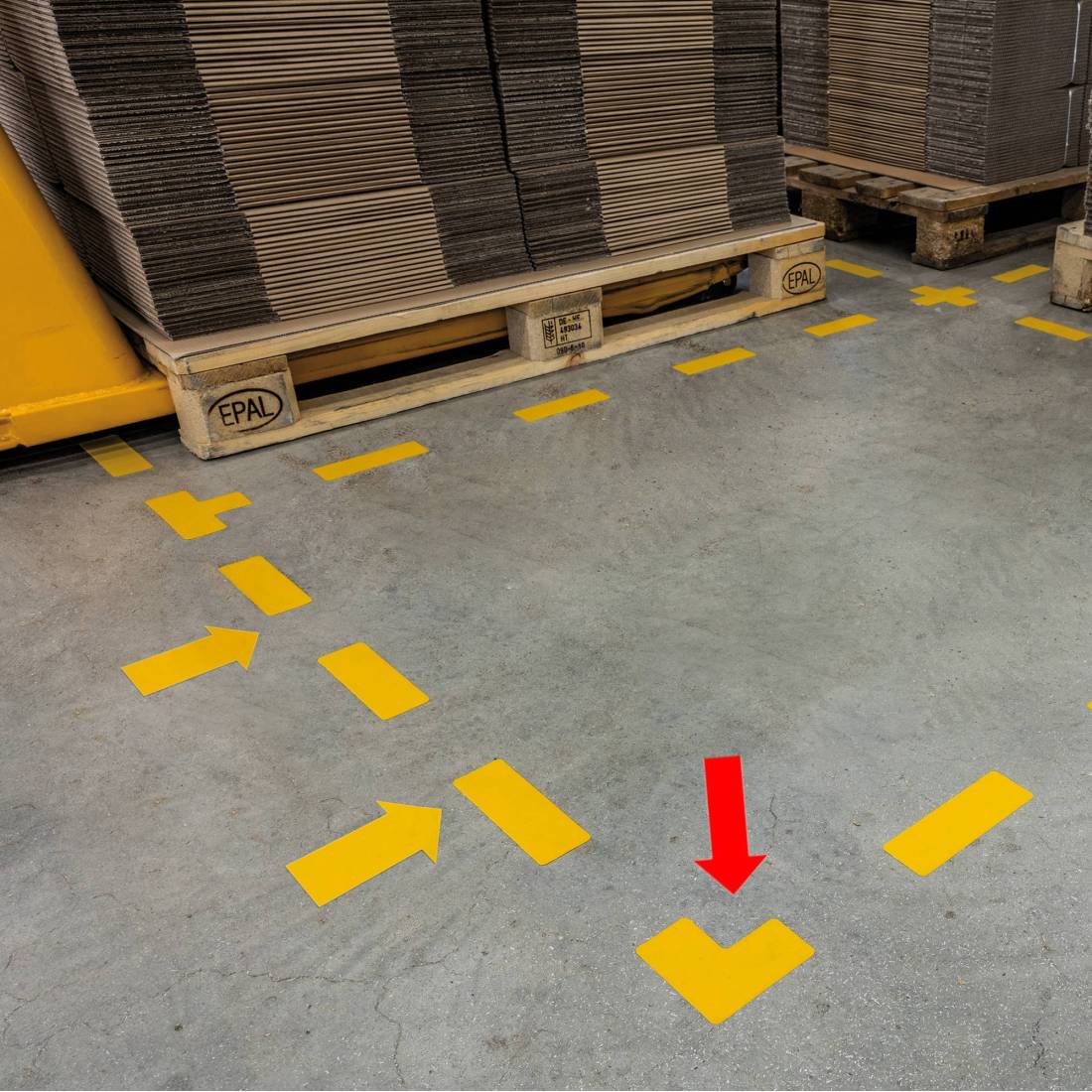 Segnaletica da pavimento sagomata per l'individuazione di aree pericolose, spazi di stoccaggio, passaggi pedonali ecc. · Forma: "L" · Simbolo adesivo per l'applicazione su pavimenti nelle aree interne · Robusto e resistente alle abrasioni · Resistenza allo scivolamento R9 conforme alla normativa DIN 51130 · Colore: RAL 1003 giallo segnale · Dimensioni: 100x100mm, spessore 0,7 mm