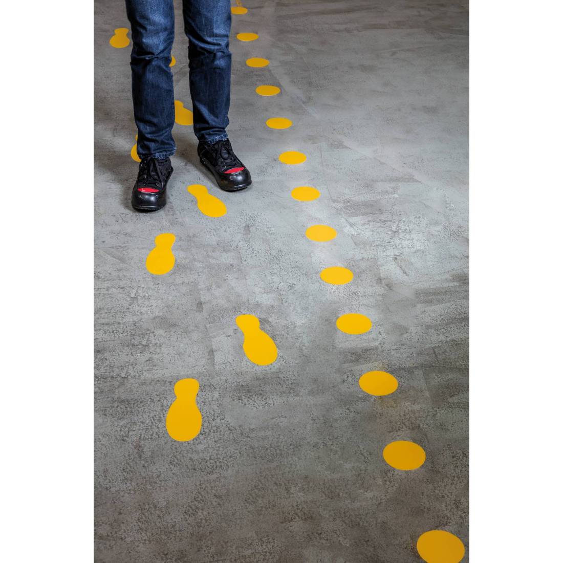 Segnaletica da pavimento sagomata per l'individuazione di aree pericolose, spazi di stoccaggio, passaggi pedonali ecc. · Forma: "Punto" · Simbolo adesivo per l'applicazione su pavimenti nelle aree interne · Robusto e resistente alle abrasioni · Resistenza allo scivolamento R9 conforme alla normativa DIN 51130 · Colore: RAL 1003 giallo segnale · Dimensioni: Ø 100 mm, spessore 0,7 mm