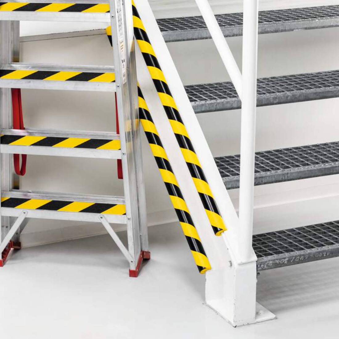 Profilo di protezione per spigoli dalla forma arrotondata in schiuma poliuretanica (100% riciclabile) flessibile. • Per uso interno • Può essere applicato su scaffali, sporgenze, travi a T in aree di produzione, reparti spedizioni e magazzini, scantinati,trombe delle scale e garage • Adatto per segnalare punti pericolosi, prevenire infortuni dovuti a urti e danni ai veicoli e carrelli di stoccaggio • I profili possono essere tagliati alla lunghezza desiderata con un taglierino affilato • Colore conforme alla norma ASR A1.3, simile a RAL 1004/9003 (giallo segnale/nero segnale) • Classe di incendio conforme alla norma DIN EN 13501-1/classe E • Resistente alla temperatura da -30°C a +70°C • Lunghezza profilo: 1 m • Larghezza fessura interna: 8 mm Fissaggio ad incastro pratico e funzionale.